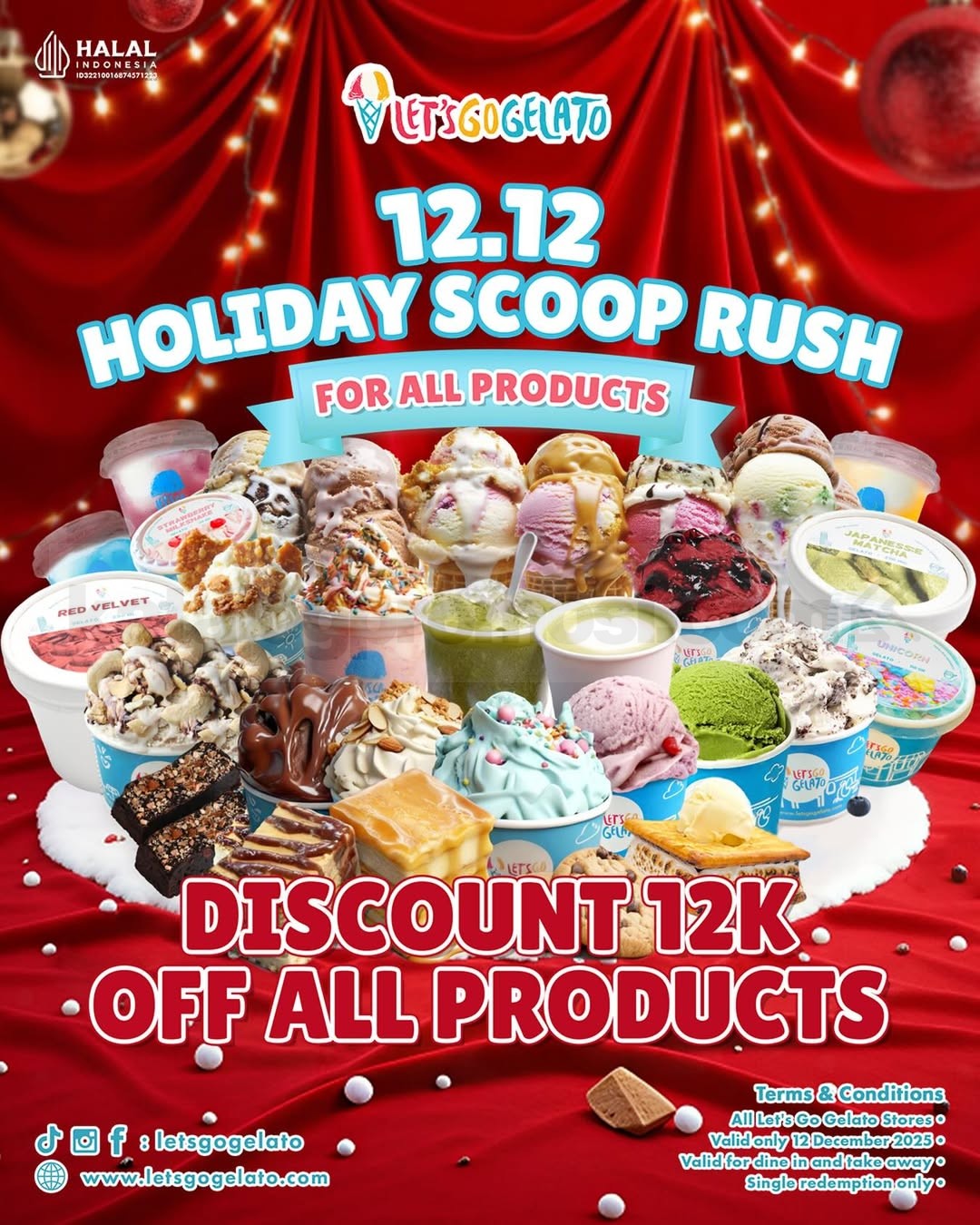 Promo Let’s Go Gelato 12.12 diskon Rp 12.000 semua varian gelato, berlaku dine-in & take away pada 12 Desember 2025 di semua outlet.