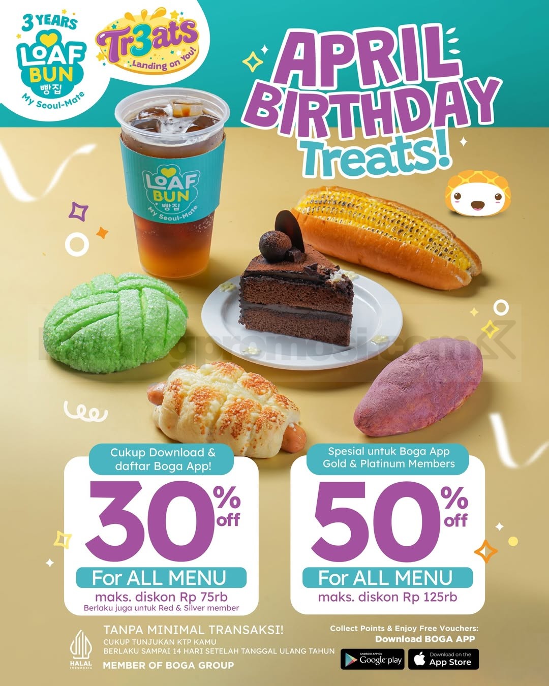 Promo Loaf Bun April Birthday Treats Diskon Hingga 50% potongan hingga Rp. 125.000 untuk member Boga App berlaku selama bulan April 2026 di seluruh outlet