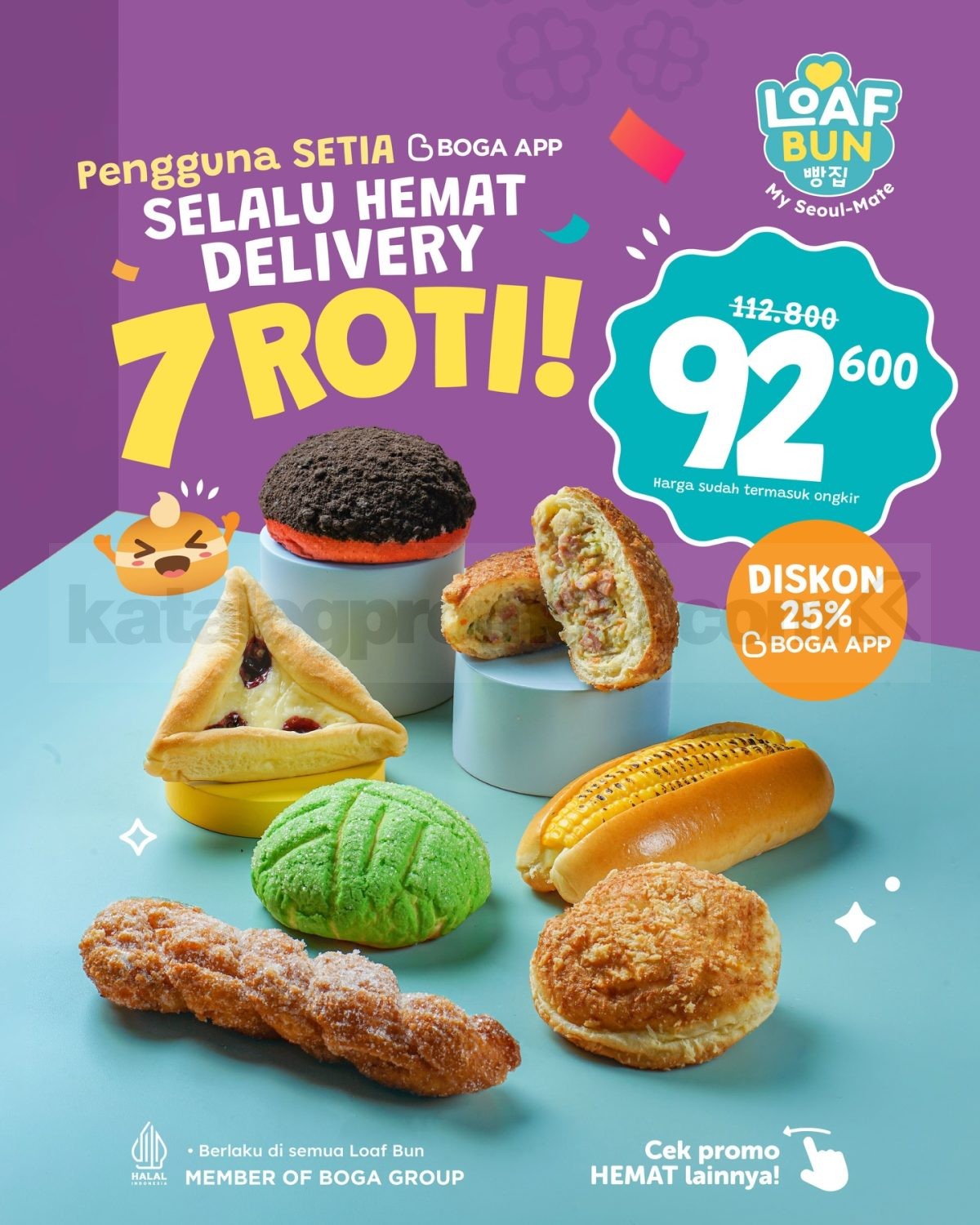 Promo Loaf Bun Delivery Hematnya Daebak diskon hingga 50% lewat Boga App, GoFood, GrabFood, dan ShopeeFood berlaku selama periode promo berlangsung.