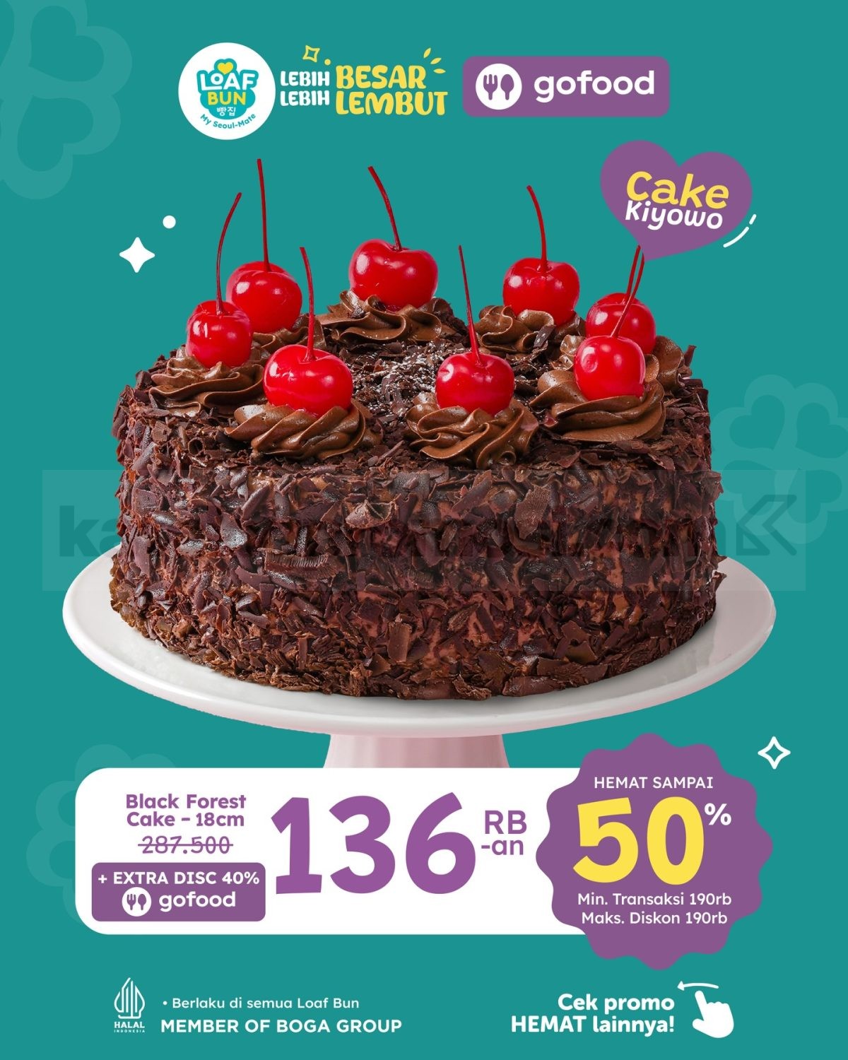 - Kalau kamu pengguna GoFood, ada diskon hingga 50% untuk Black Forest Cake ukuran 18 cm dengan minimal transaksi Rp190.000 dan potongan maksimal Rp190.000. Pilihan ini pas buat yang lagi cari cake ukuran besar buat dinikmati bareng keluarga atau teman.