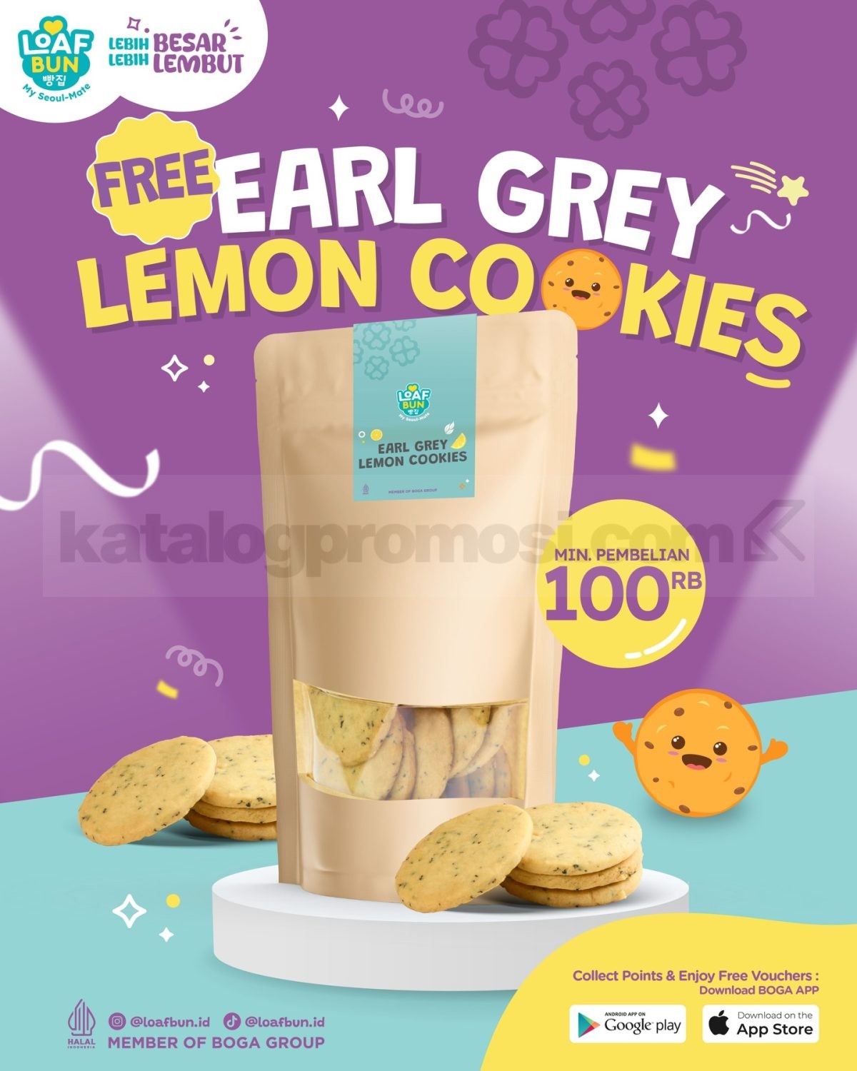 Promo Loaf Bun FREE Earl Grey Lemon Cookies dengan minimal belanja Rp. 100.000, nikmati camilan gratis ini berlaku selama periode promo berlangsung di seluruh outlet.