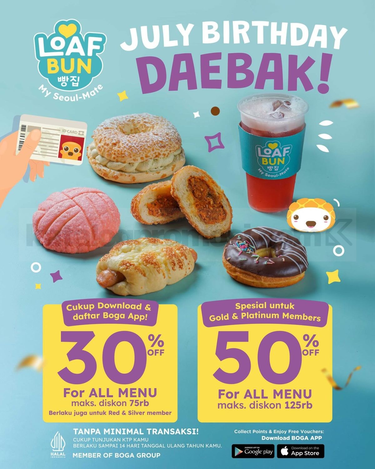Promo Loaf Bun December Birthday Daebak Diskon hingga 50% untuk semua menu tanpa minimal transaksi melalui Boga App, berlaku sampai 14 hari setelah ulang tahun selama bulan desember.