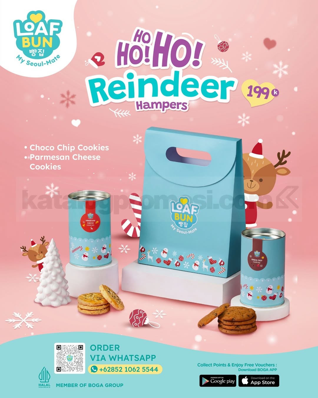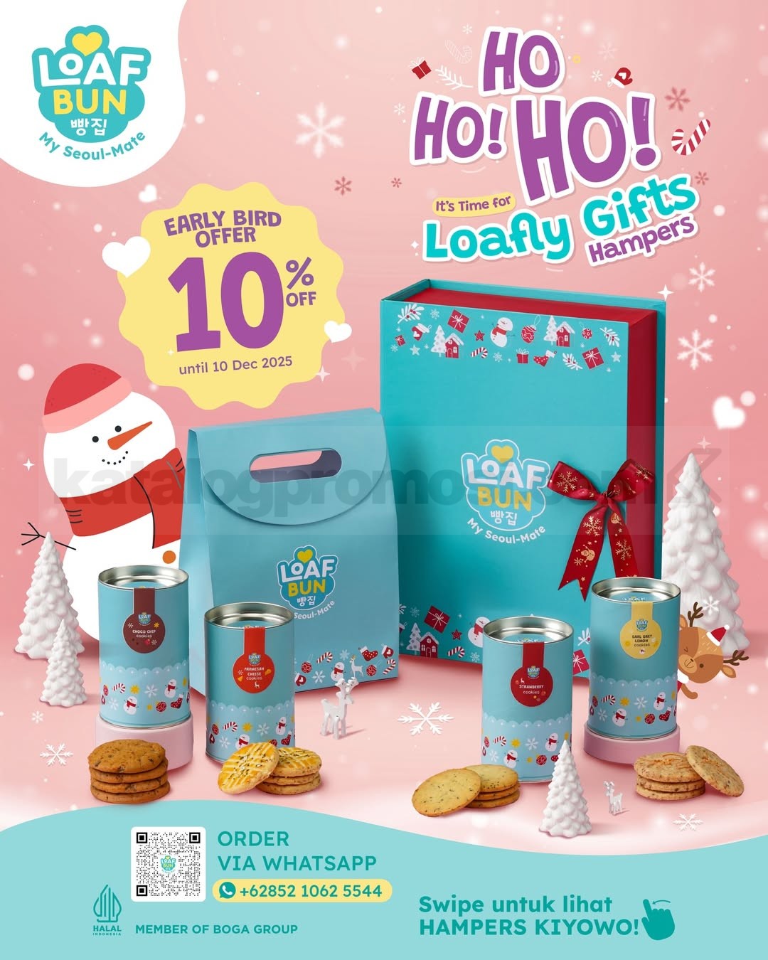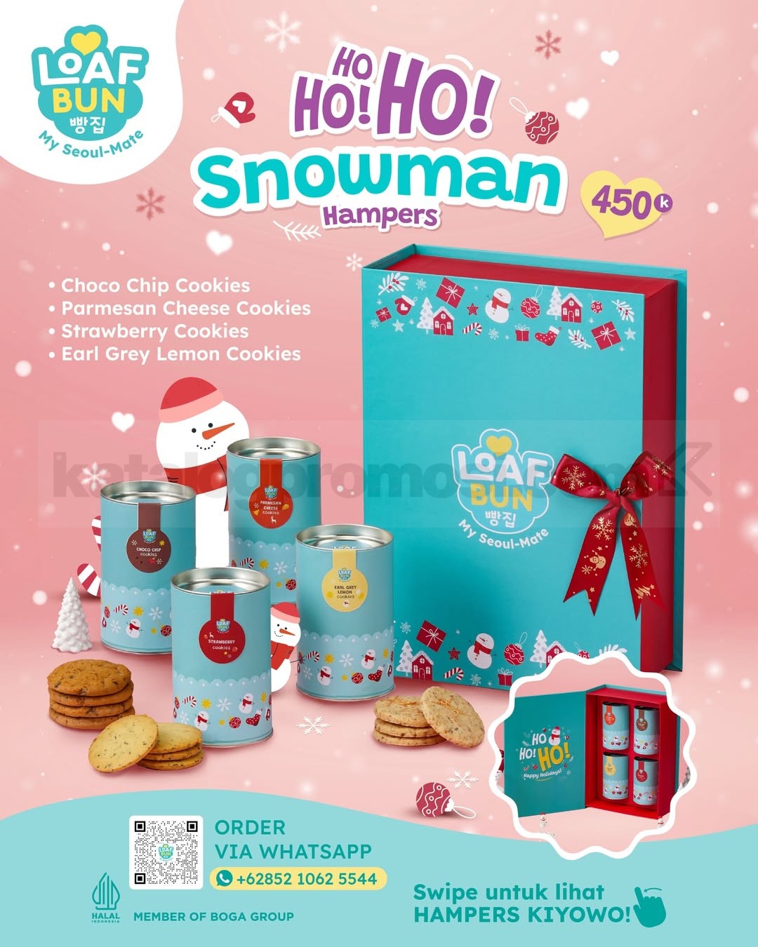 Promo Loaf Bun Loafly Gifts Hampers diskon 10% berlaku hingga 10 Desember 2025 dengan pilihan Snowman & Reindeer Hampers.