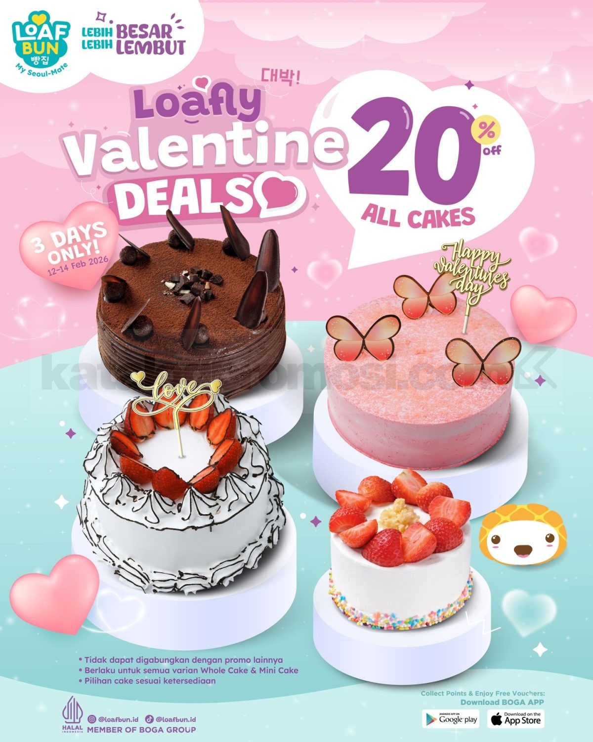 Promo Loaf Bun Loafly Valentine Deals Diskon 20% All Cake untuk Whole Cake & Mini Cake berlaku mulai tanggal 12 Februari 2026 – 14 Februari 2026.