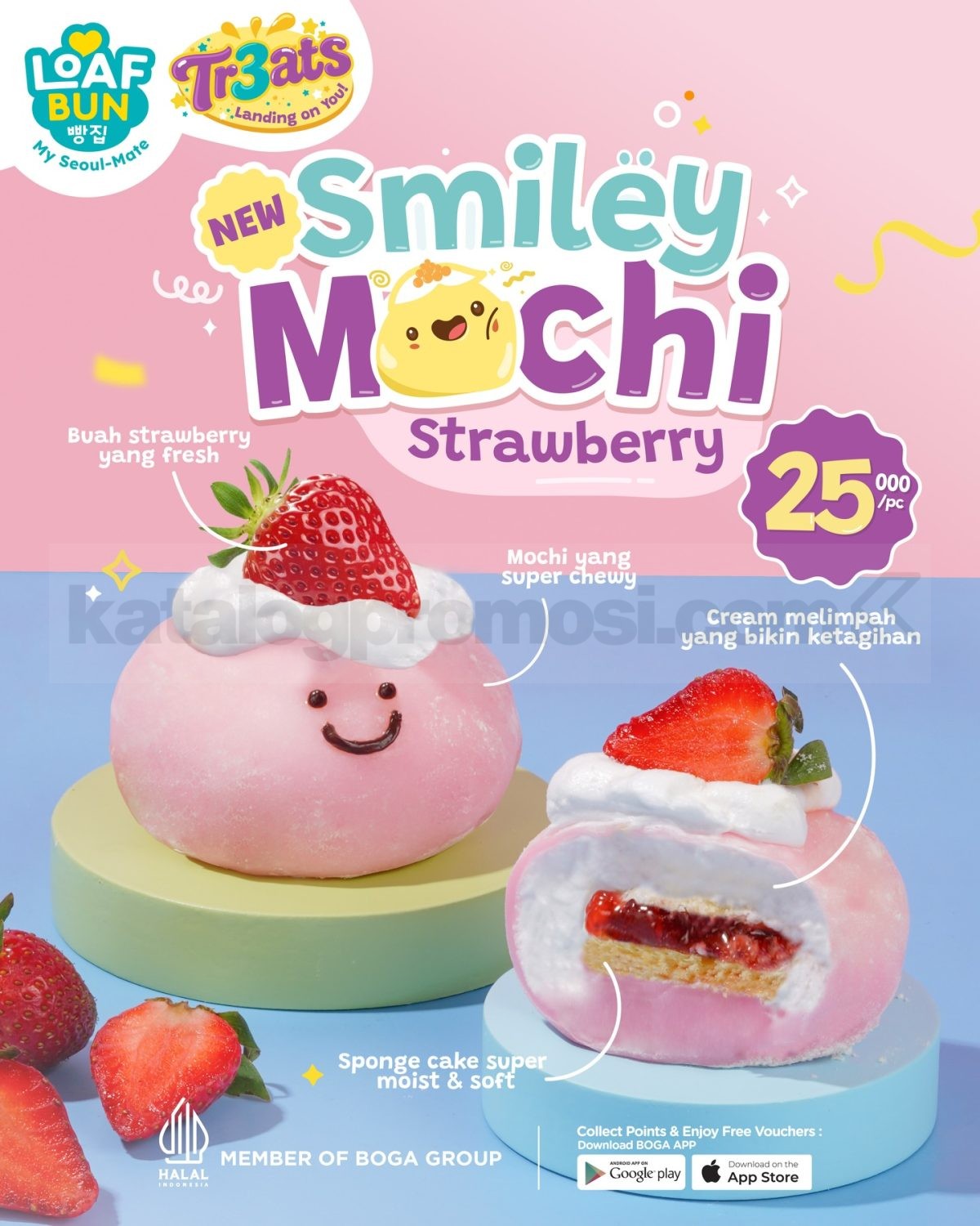 Promo LOAF BUN NEW Smiley Mochi Rp. 25.000 mochi lembut isi buah segar dengan varian Strawberry, Blueberry, Yuzu berlaku selama periode promo di seluruh outlet.