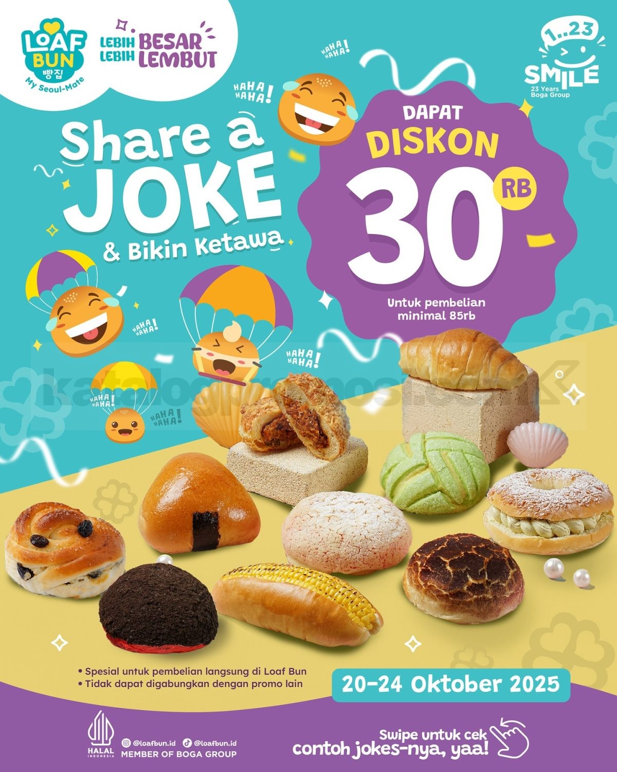 Promo Loaf Bun Share a Joke Diskon Rp. 30.000 berlaku 20–24 Oktober 2025 untuk pembelian minimal Rp. 85.000 dine-in atau take away di outlet Loaf Bun.
