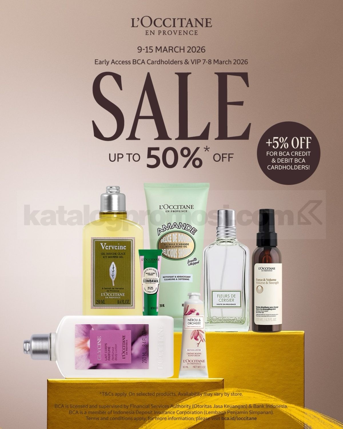 Promo L’Occitane Exclusive Sale diskon hingga 50% periode 9 – 15 Maret 2026 dan early access 7 – 8 Maret untuk BCA Cardholders dan VIP.