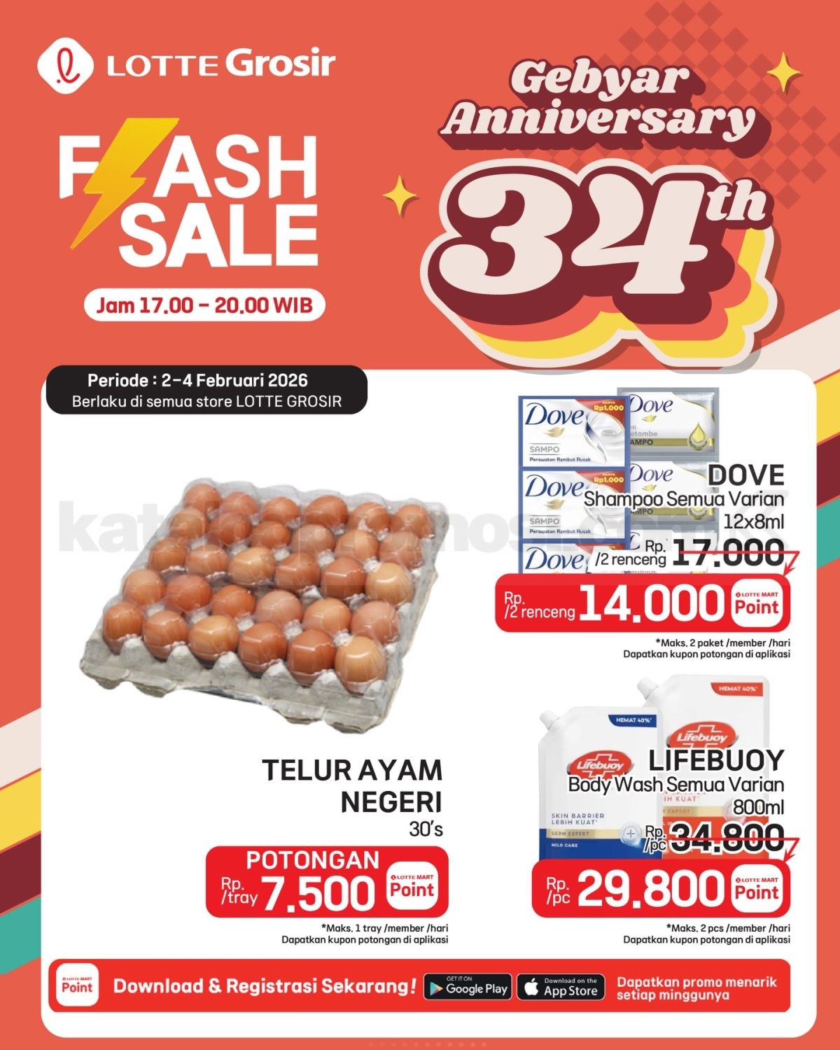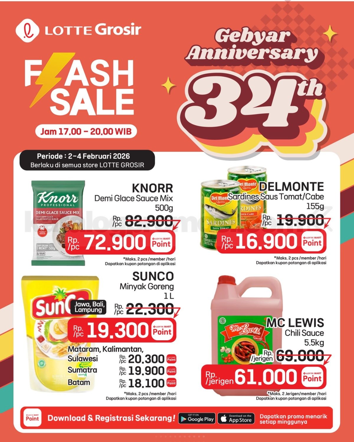 Promo LOTTE Grosir Flash Sale berlangsung 2 – 4 Februari 2026 pukul 17.00 – 20.00 WIB di seluruh store dengan harga spesial produk kebutuhan favorit.