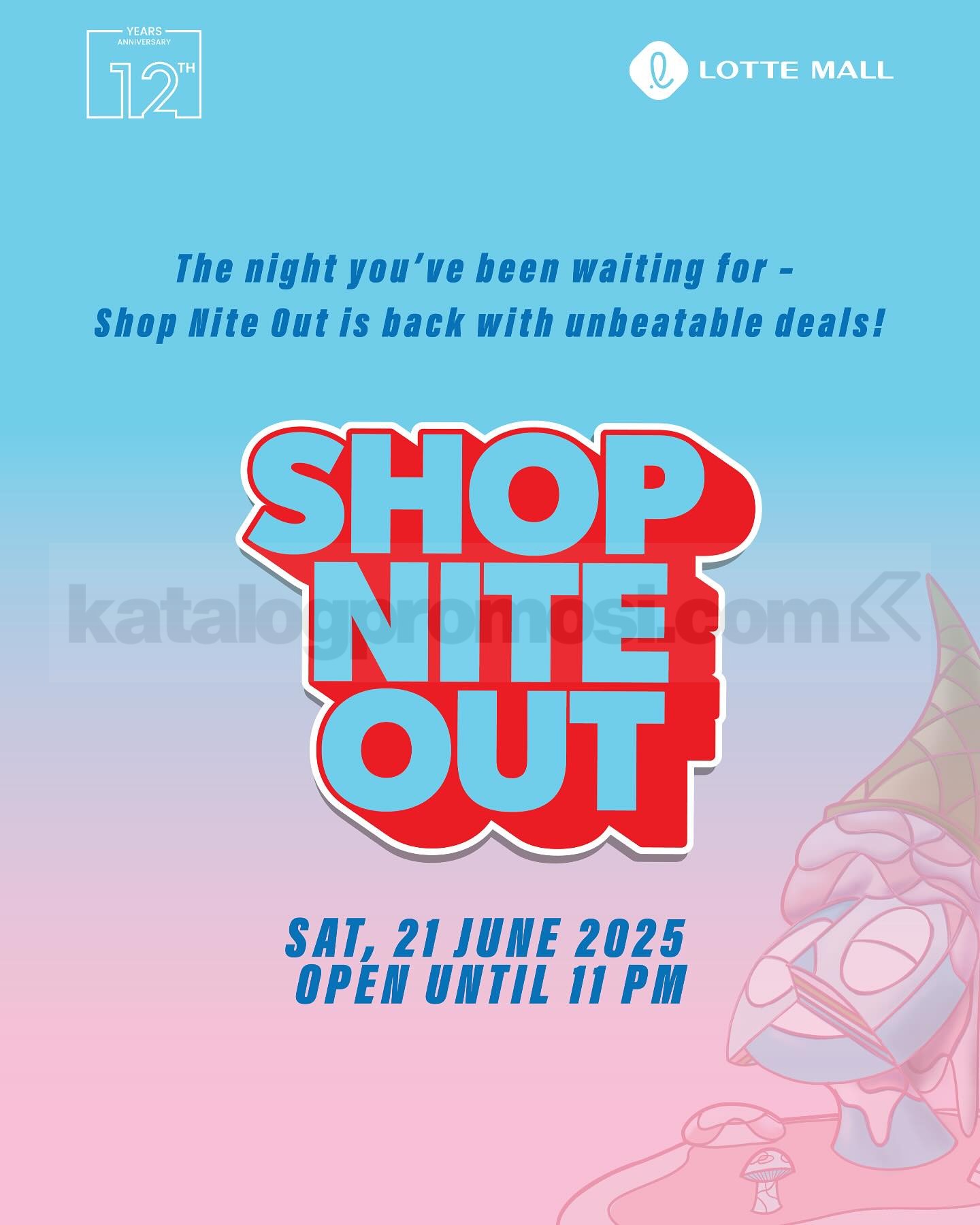 Rayakan Anniversary ke-12 Lotte Mall Jakarta dengan belanja seru sampai malam di Shop Nite Out, khusus tanggal 21 Juni 2025! Shopping party ini bakal berlangsung sampai jam 23.00 WIB, jadi kamu bisa puas keliling store favorit tanpa buru-buru!