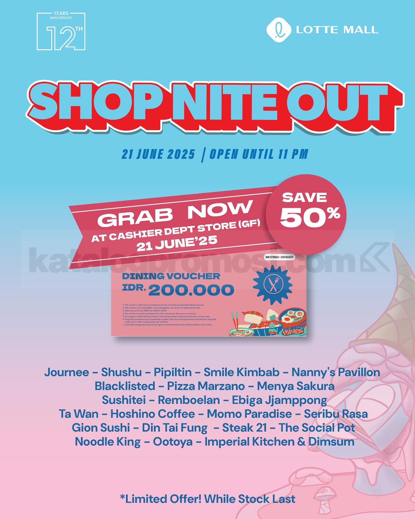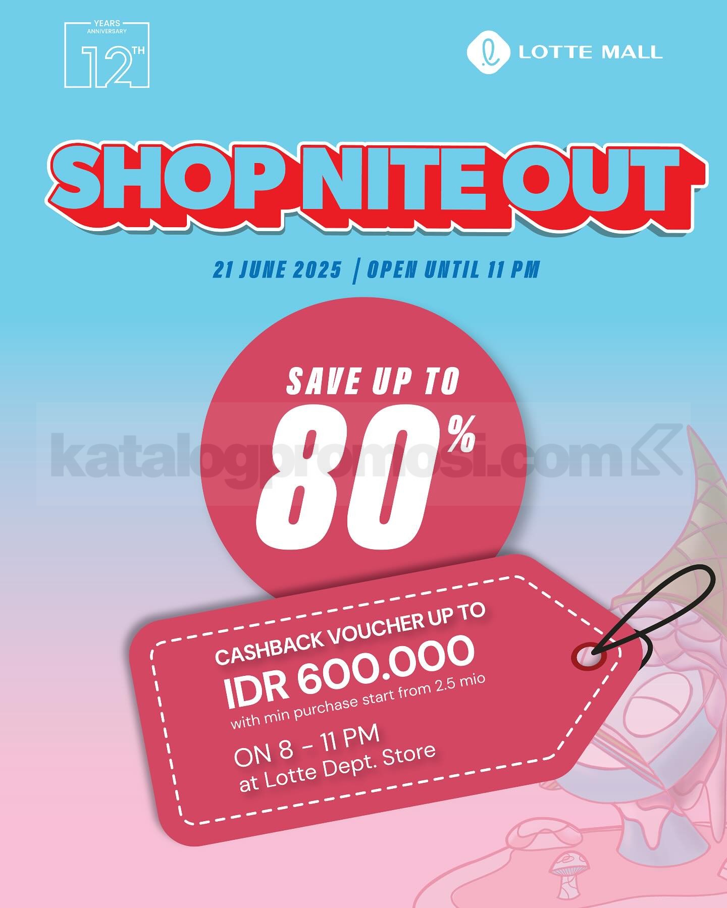 Promo Lotte Mall Jakarta Shop Nite Out cuma 21 Juni 2025! Diskon s.d 80% dan cashback hingga Rp600.000 di Lotte Dept Store sampai jam 11 malam!