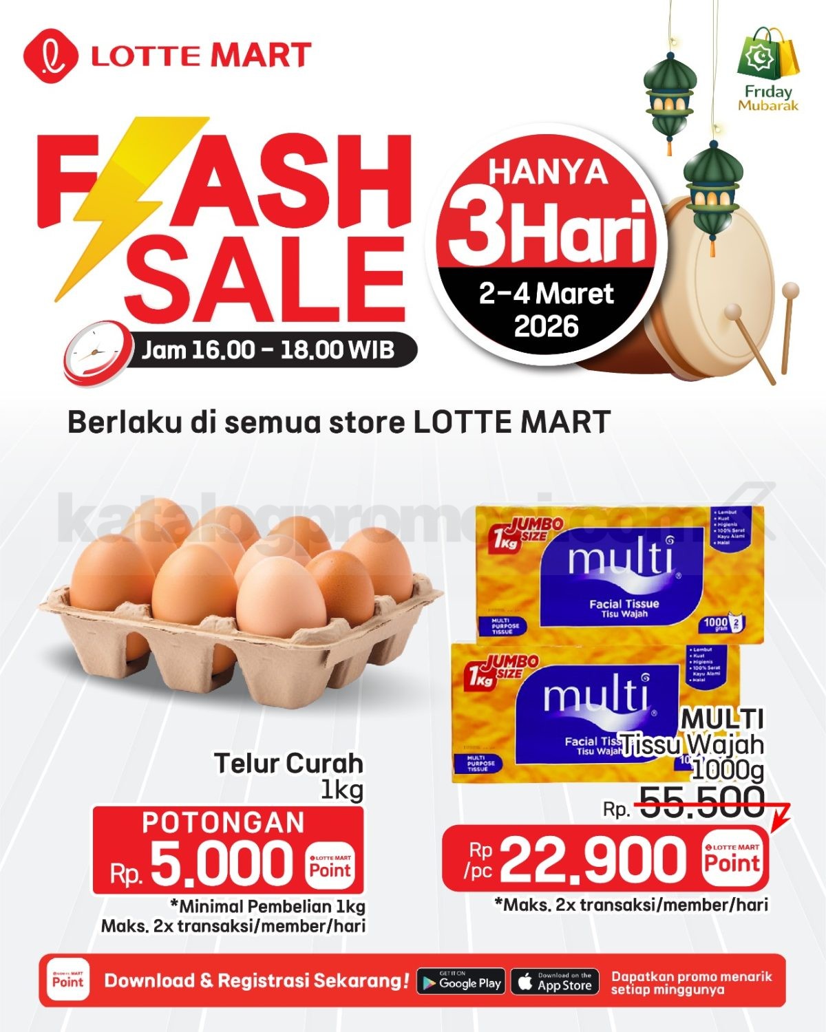 Promo LOTTE MART Flash Sale 3 Hari periode 2 – 4 Maret 2026 pukul 16.00 – 18.00 WIB Berlaku di semua store LOTTE MART sesuai batas transaksi per member.