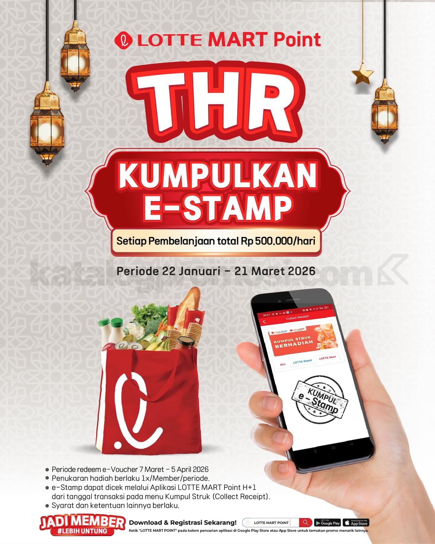 Promo LOTTE MART THR Kumpulkan E-Stamp tukar hadiah menarik berlaku 22 Januari – 21 Maret 2026 dengan mekanisme belanja Rp. 500.000 per hari untuk kumpulkan e-Stamp.