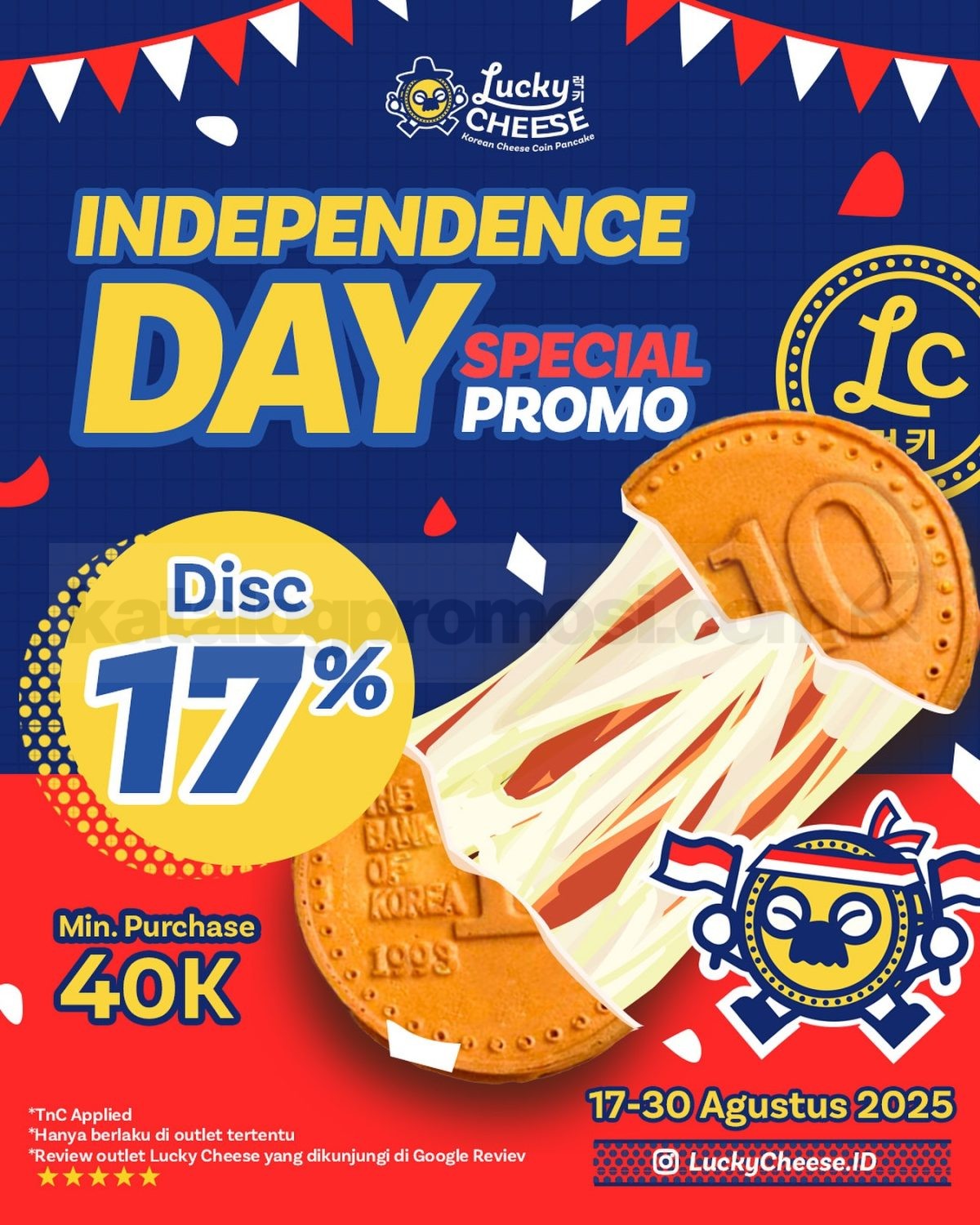 Rayakan kemerdekaan dengan cara unik bareng Lucky Cheese. Mau hemat belanja dengan diskon 17% atau mau ajak teman bernama Agus buat dapet pancake gratis, semuanya bikin suasana makin fun. Jangan sampai kelewatan, karena periode promo terbatas dan cuma berlaku di outlet tertentu.
