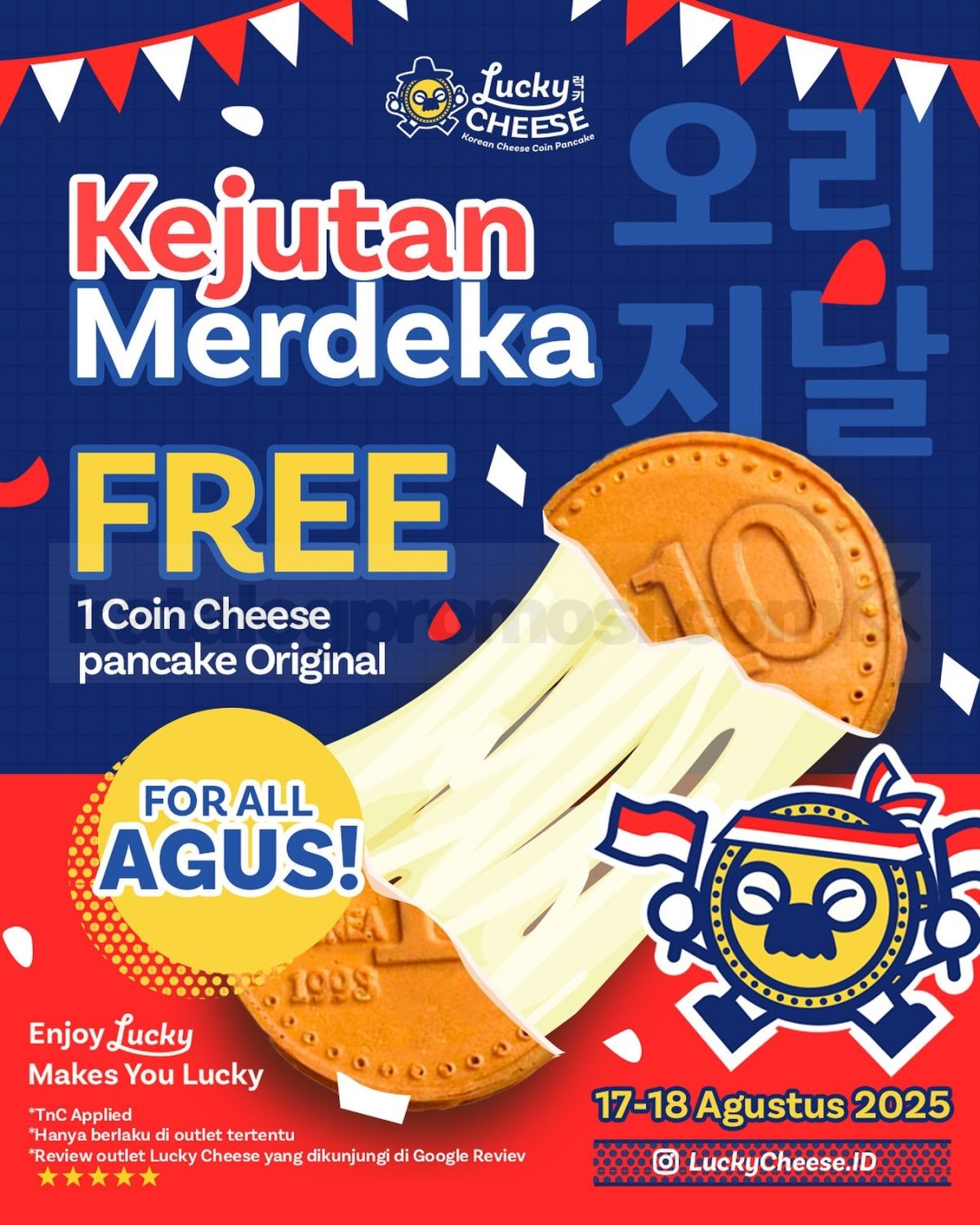 Promo Lucky Cheese Merdeka diskon 17% dan gratis 1 Coin Cheese Pancake khusus nama Agus berlaku mulai tanggal 17-30 Agustus 2025 di outlet tertentu.