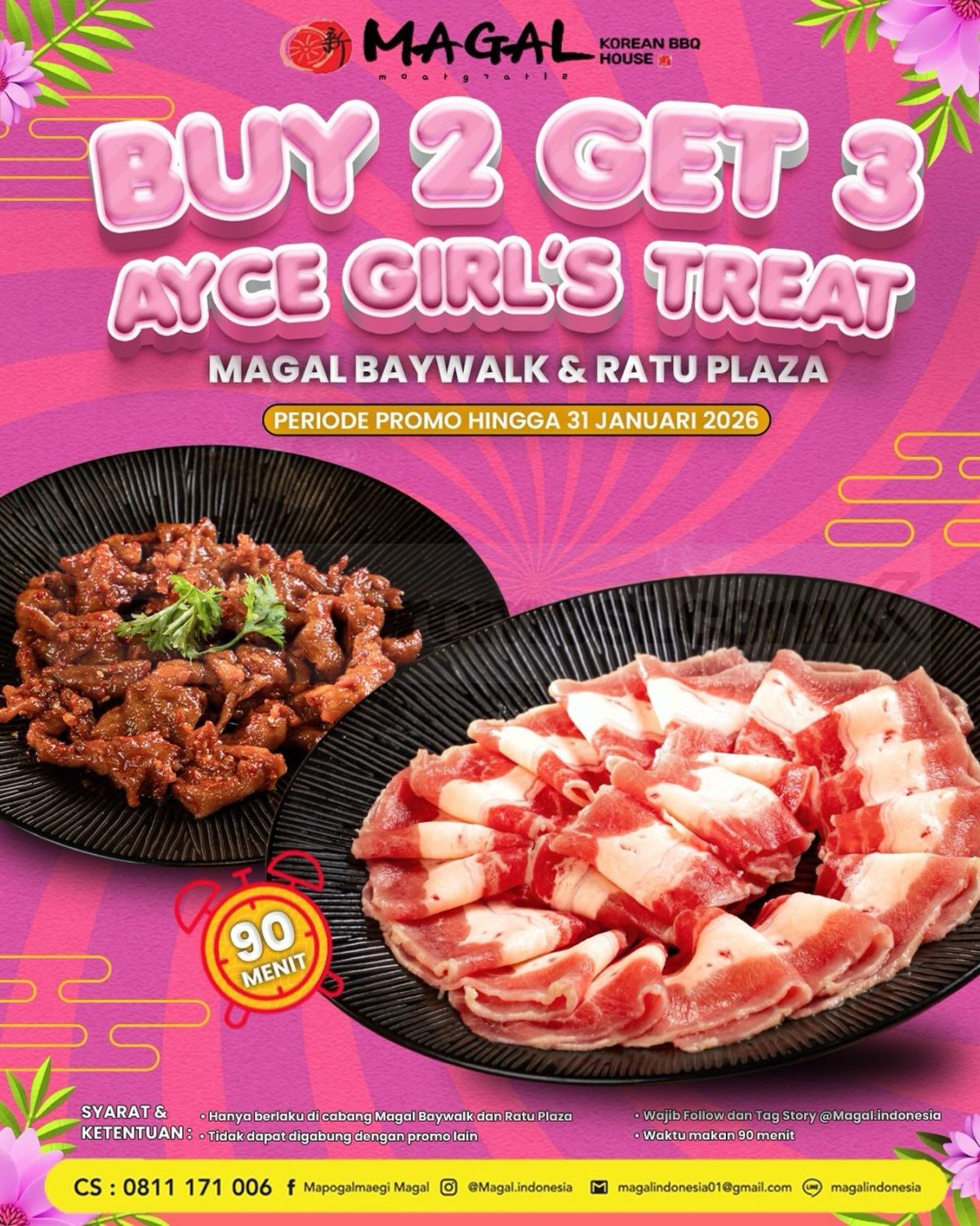 Promo MAGAL AYCE Girl’s Treat Buy 2 Get 3 berlaku hingga 31 Januari 2026 khusus perempuan dengan konsep all you can eat Korean BBQ di outlet tertentu.