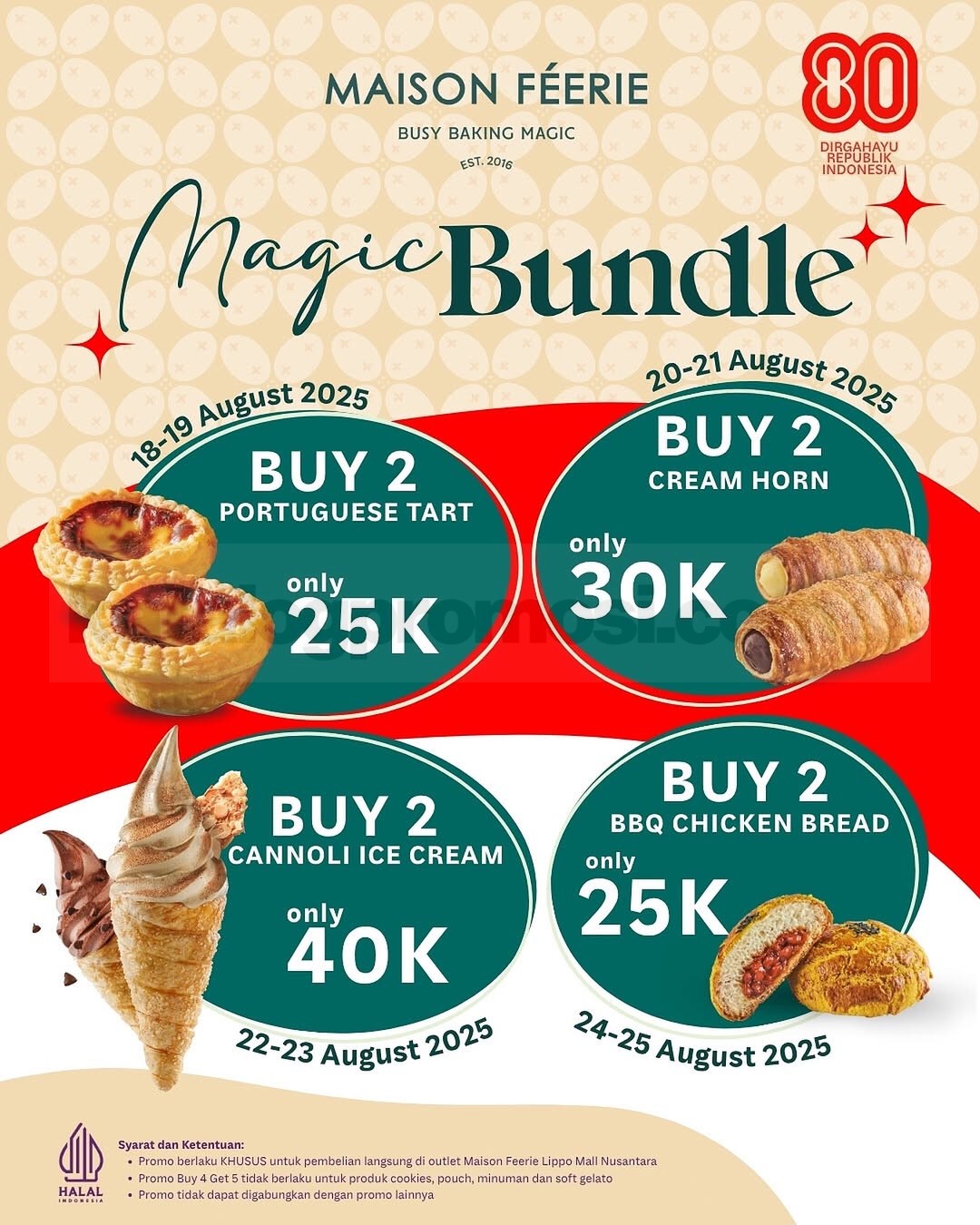 Promo Maison Féerie Magic Bundle hadir bikin bulan Agustus kamu makin magical ✨. Selama 8 hari aja, kamu bisa nikmatin berbagai pastry premium ala Maison Féerie dengan harga bundling super ramah kantong. Mulai dari Portuguese Tart sampai BBQ Chicken Bread, semuanya tersedia dalam paket beli 2 dengan harga spesial. Promo Maison Féerie Magic Bundle cuma bisa kamu nikmati tanggal 18–25 Agustus 2025 secara bergantian sesuai jadwal, khusus di outlet Maison Féerie – Lippo Mall Nusantara. Menu yang ikutan promo: