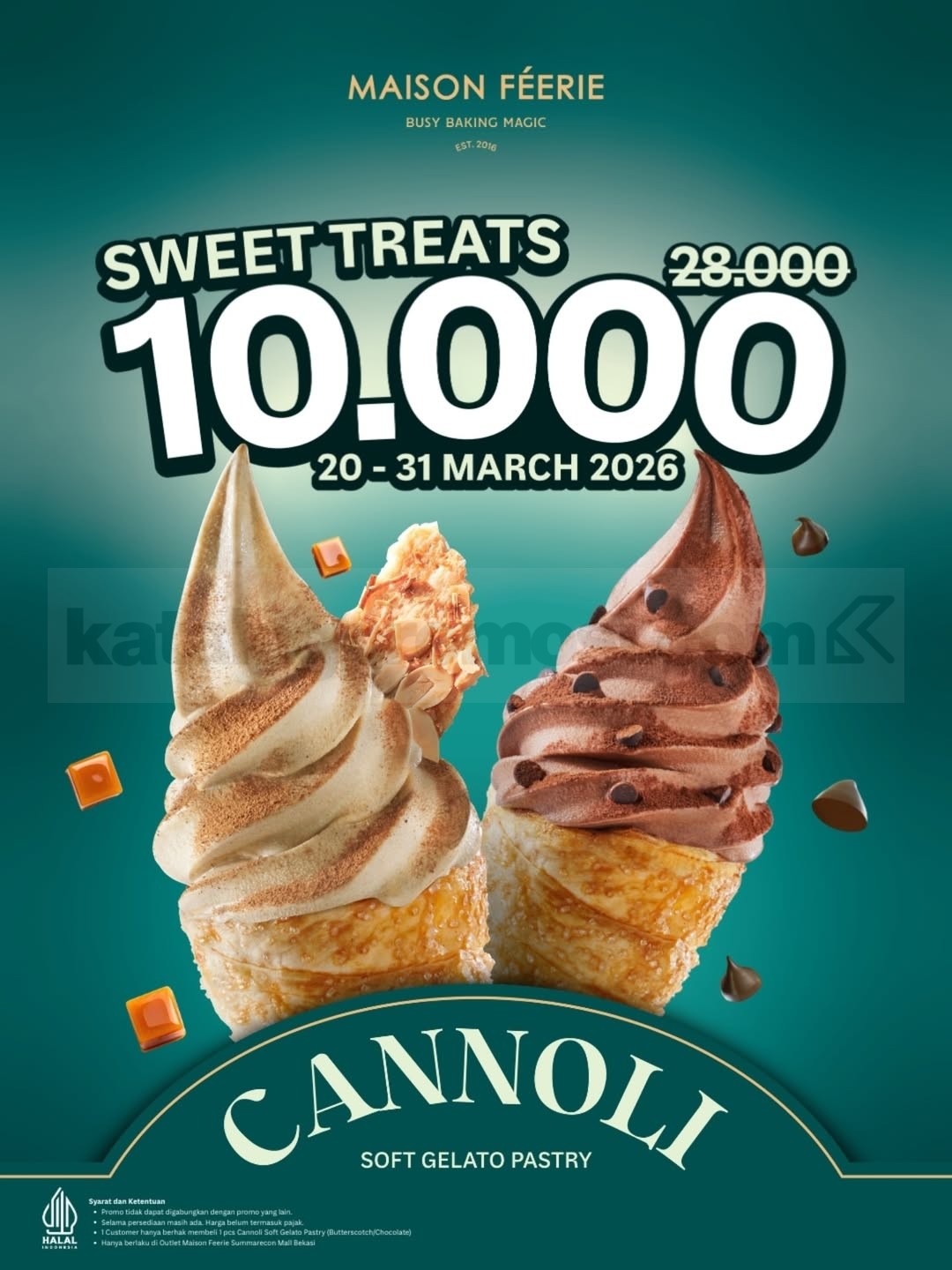 Promo Maison FĂ©erie Sweet Treats Cannoli Ice Cream Rp. 10.000 nikmati gelato pastry favorit dengan harga spesial berlaku mulai tanggal 20 Maret 2026 – 31 Maret 2026 di Summarecon Mall Bekasi