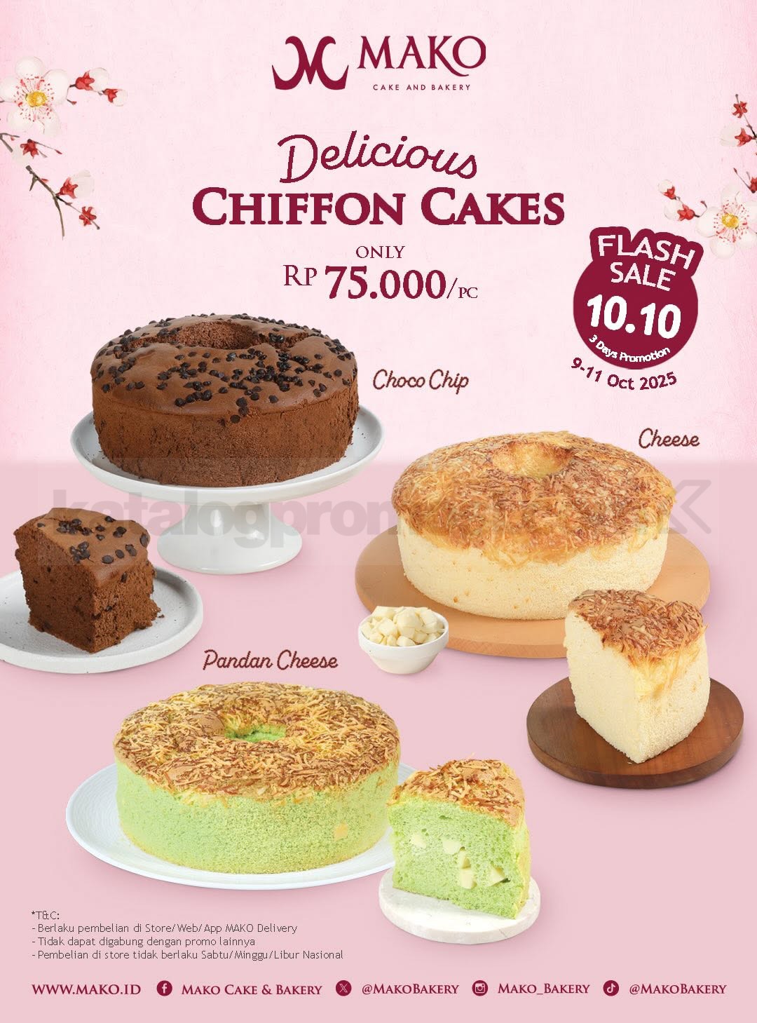 Promo MAKO Cake 10.10 Flash Sale Chiffon Cake Rp. 75.000 berlaku 9โ11 Oktober 2025 di store, website, dan aplikasi MAKO Delivery.