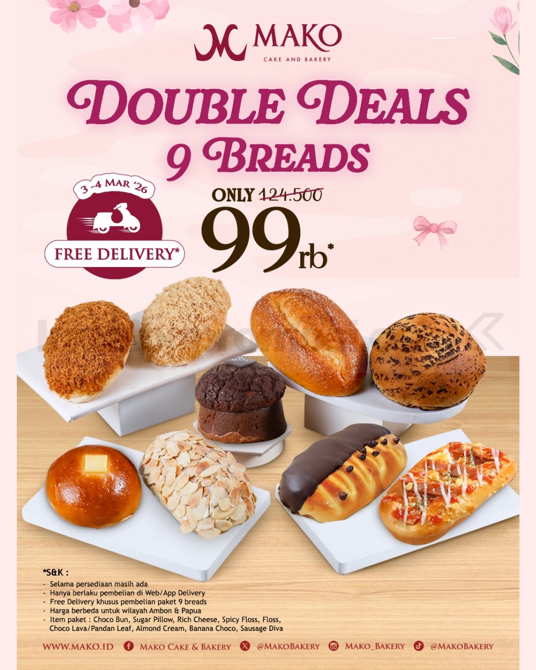 Promo MAKO 3.3 Double Deals 9 Roti Rp. 99.000 periode 3 β 4 Maret 2026 untuk pembelian melalui Web/App Delivery termasuk FREE Delivery sesuai ketentuan wilayah.