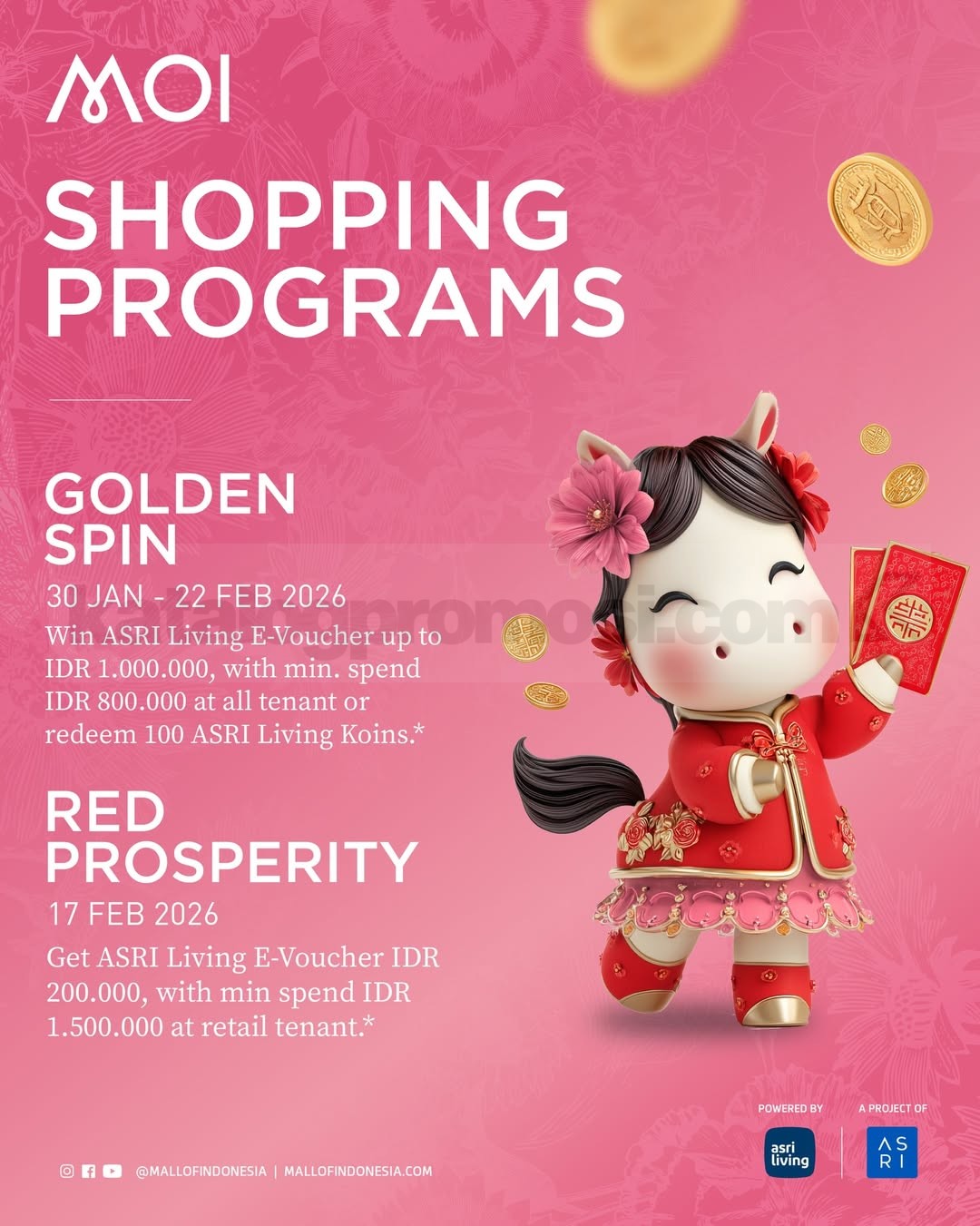 • Ikuti program Golden Spin dengan berbelanja minimal Rp. 800.000 di seluruh tenant Mall of Indonesia untuk mendapatkan kesempatan memenangkan ASRI Living E-Voucher hingga Rp. 1.000.000
