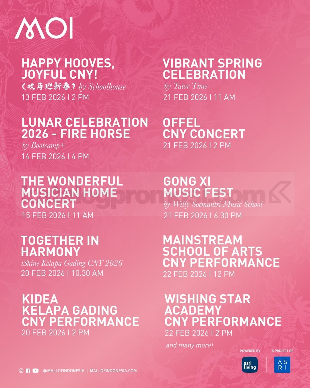 • Pada tanggal 17 Februari 2026, pengunjung dapat mengikuti program Red Prosperity dengan hadiah langsung ASRI Living E-Voucher senilai Rp. 200.000 setelah memenuhi minimum belanja Rp. 1.500.000 di tenant retail