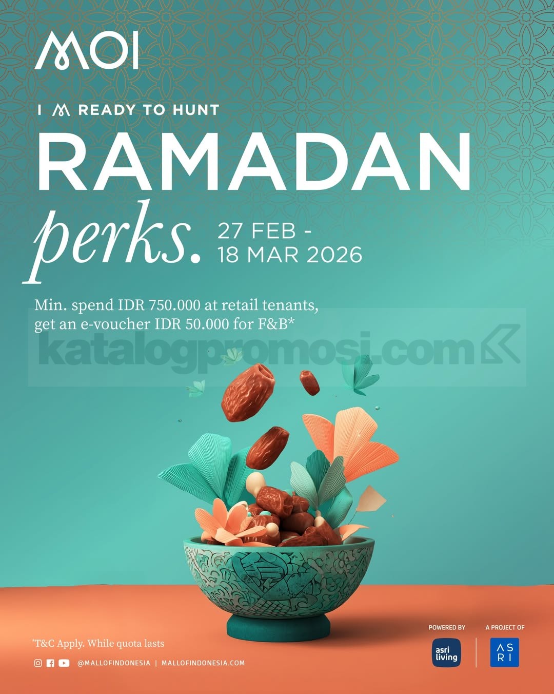 Kalau kamu sudah merencanakan belanja kebutuhan Ramadan atau ingin sekadar jalan-jalan ke mall, promo ini bisa jadi kesempatan menarik. Dengan belanja minimal Rp. 750.000 di tenant retail Mall of Indonesia, kamu bisa mendapatkan e-voucher ASRI Living Rp. 50.000 untuk menikmati menu favorit di tenant F&B. Jangan lewatkan kesempatan ini dan manfaatkan promo Ramadan Perks sekarang!