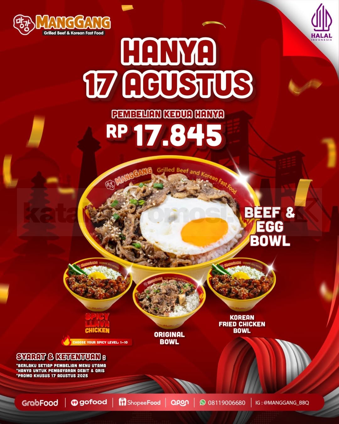 Promo MangGang Merdeka! Menu kedua Rp17.845 khusus pembelian menu utama pada tanggal 17 Agustus 2025 pakai QRIS & Debit.