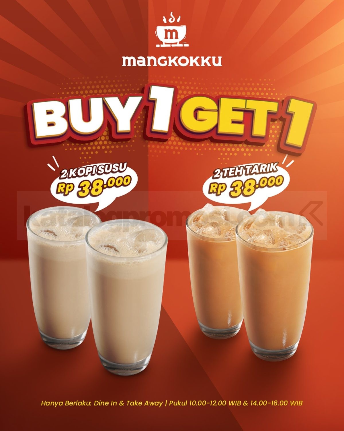 Promo Mangkokku Buy 1 Get 1 Minuman Rp.38.000 untuk Kopi Susu dan Teh Tarik, berlaku selama persediaan masihada di seluruh outlet pada jam tertentu.