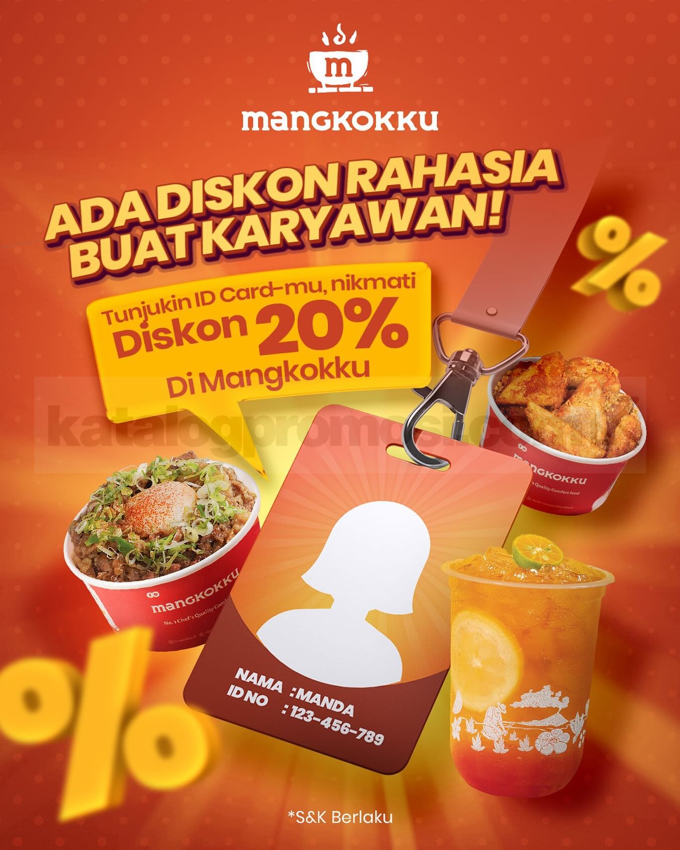 Promo Mangkokku diskon 20% khusus karyawan dengan tunjukkan ID Card berlaku Senin sampai Jumat jam 13.00–19.00.