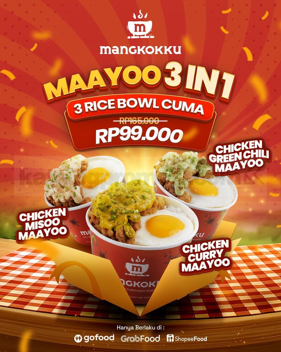 Promo Mangkokku MAAYOO 3in1 berlaku untuk menu Chicken Curry MAAYOO, Chicken Green Chili MAAYOO, dan Chicken Misoo MAAYOO.