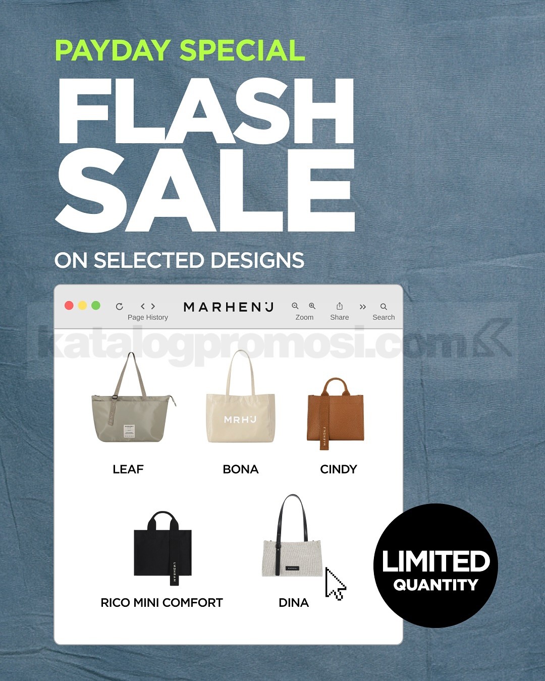 Yuk, manfaatkan promo Marhen.J Payday & Flash Sale sebelum periode berakhir. Belanja sekarang dan bawa pulang tas favoritmu dengan harga spesial!