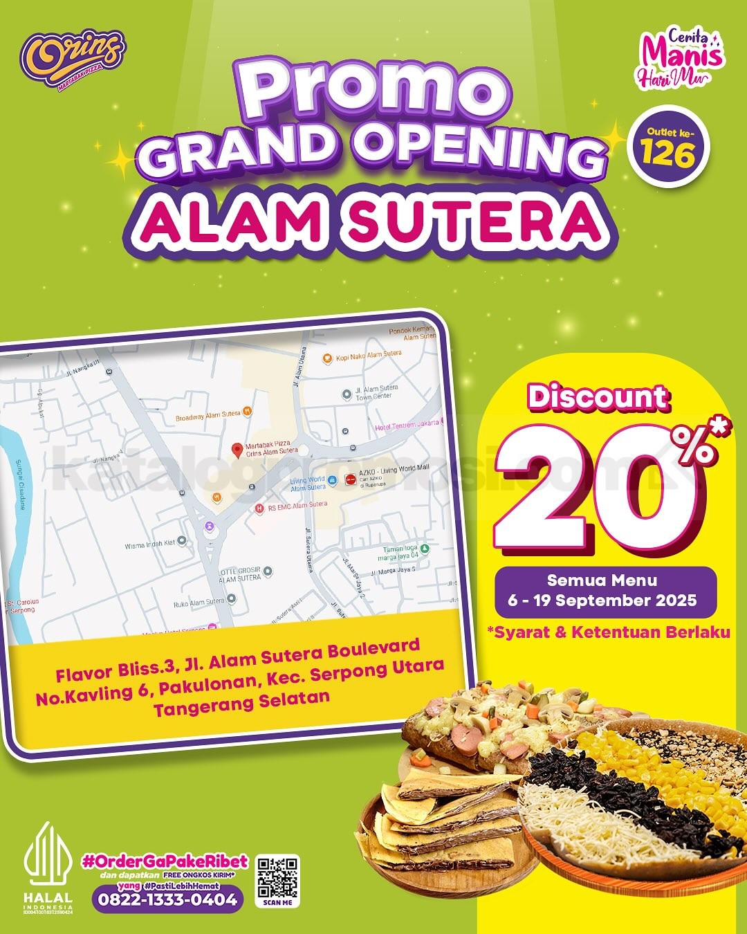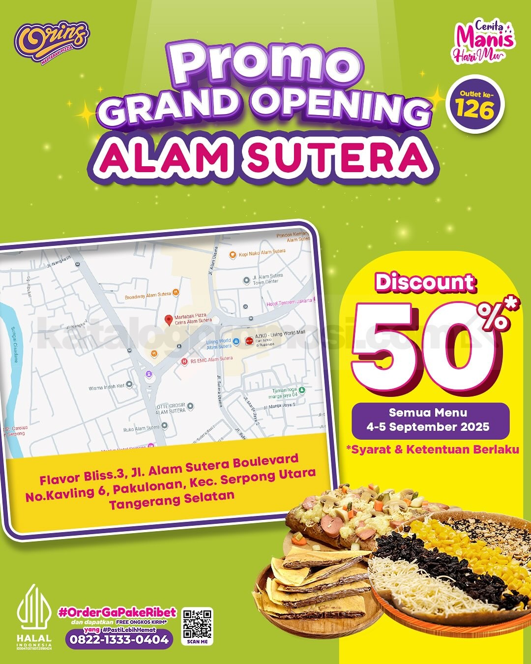 Promo Martabak Orins Alam Sutera diskon 50% berlaku 4 – 5 September 2025, lanjut diskon 20% sampai 19 September 2025, berlaku untuk semua menu.