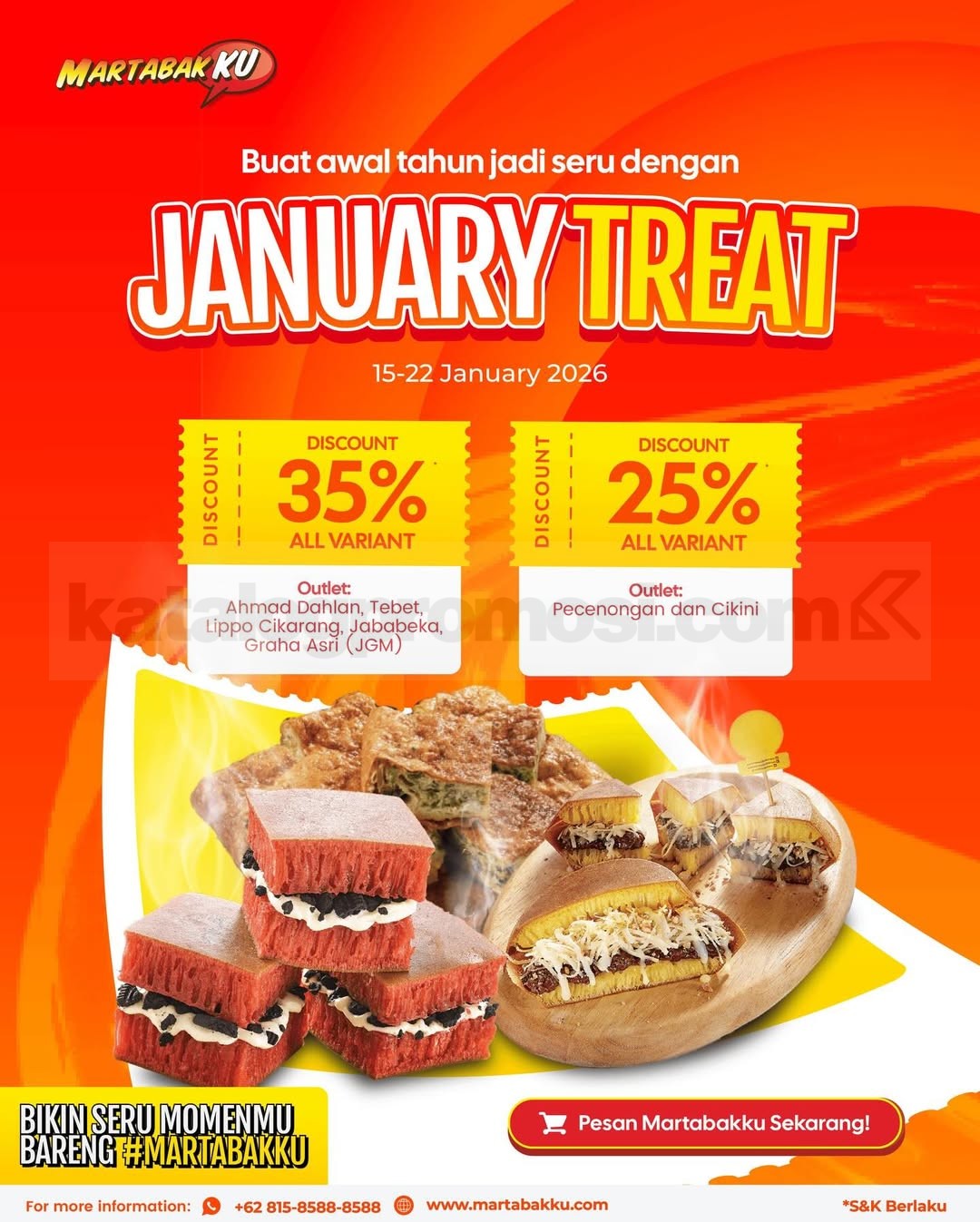 Promo Martabakku January Treat diskon hingga 35% untuk semua varian dengan mekanisme langsung di outlet, berlaku mulai tanggal 15 Januari 2026 – 22 Januari 2026 di lokasi tertentu.