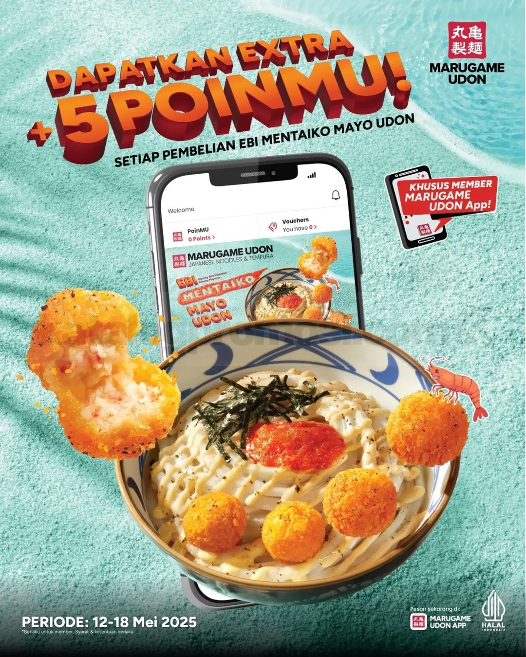 Promo Marugame Udon Ebi Mentaiko Mayo Udon cuma order via app langsung dapet 5 PoinMU! Berlaku 12โ18 Mei di outlet tertentu.