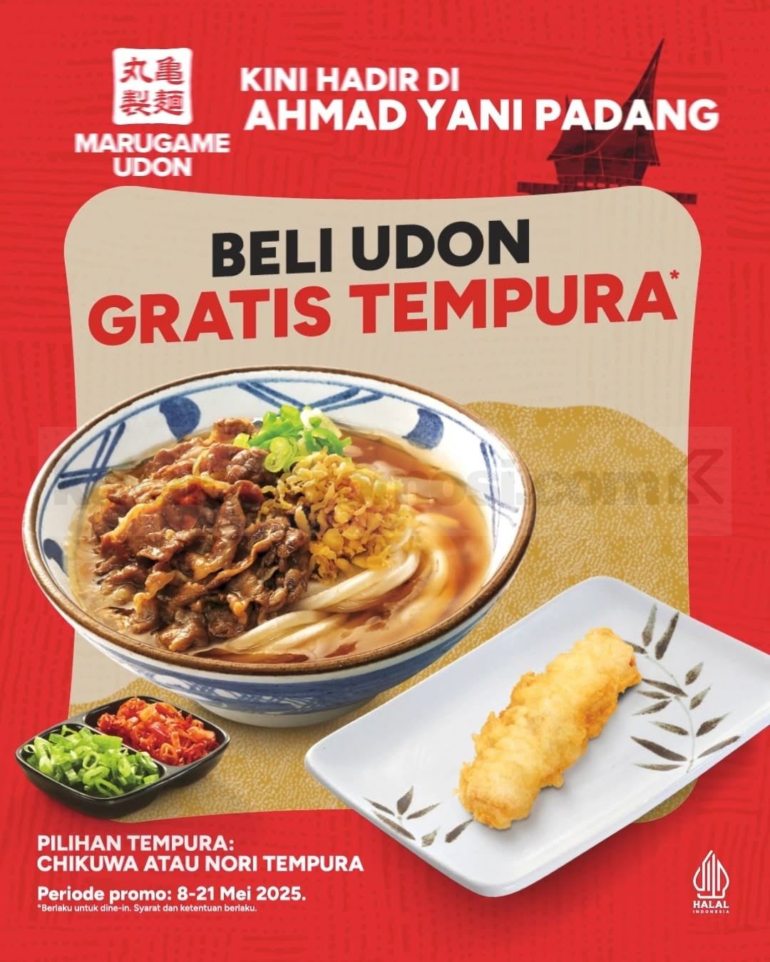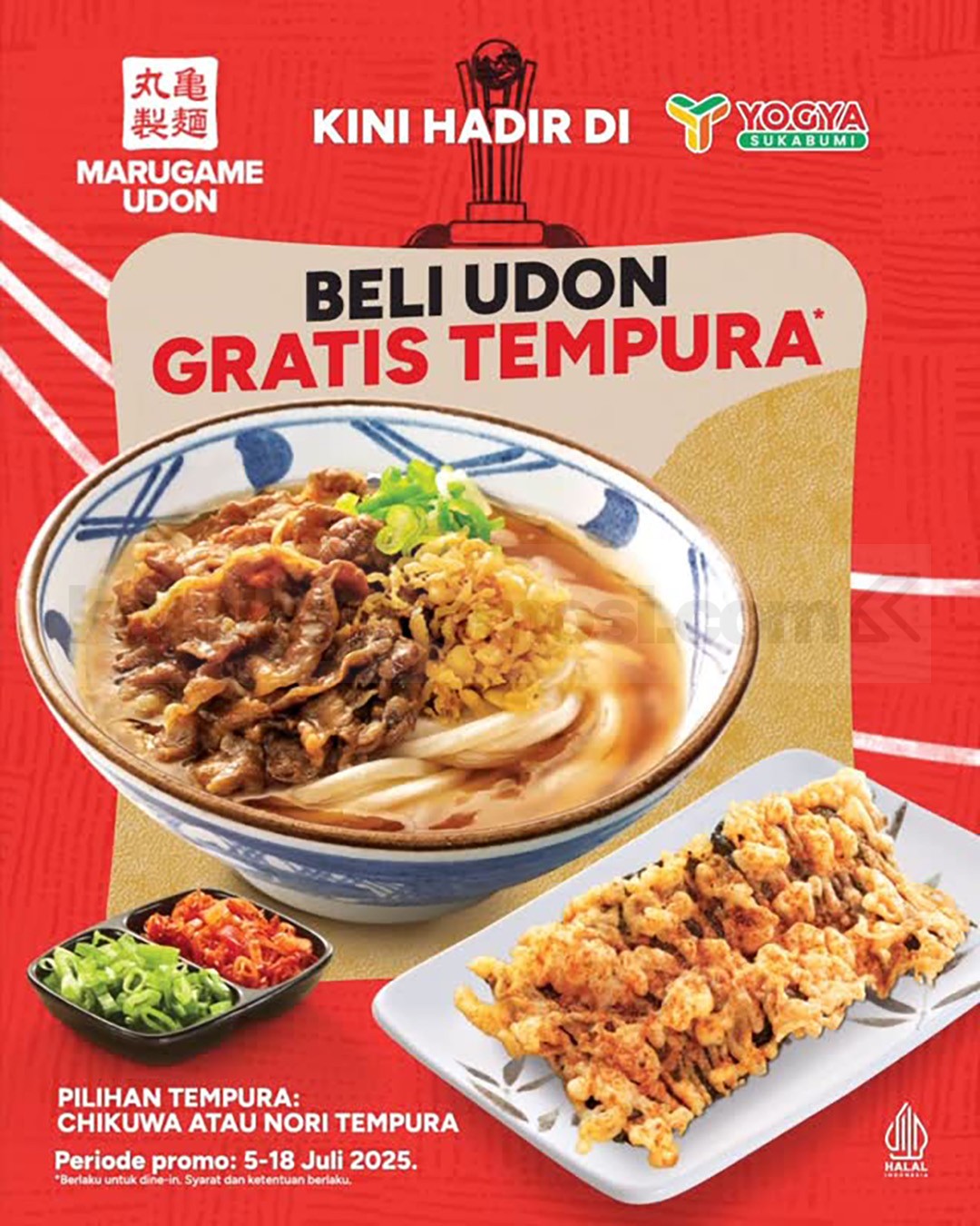 Promo Marugame Udon Grand Opening Sukabumi! Beli 1 udon gratis 1 tempura favorit, berlaku dine in di Yogya Sukabumi mulai 5–18 Juli 2025