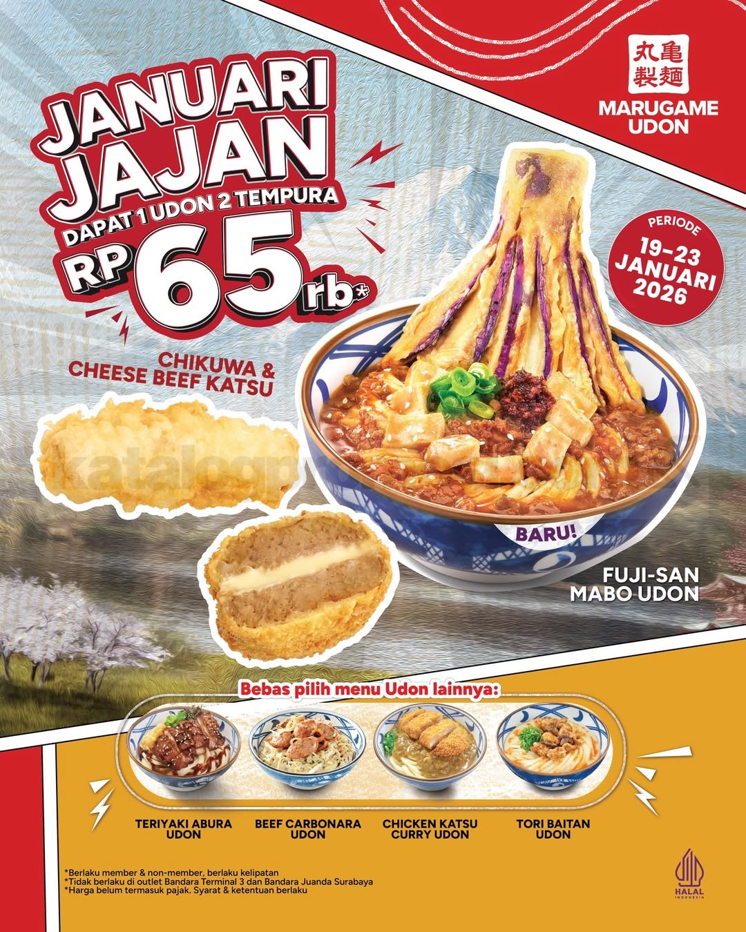 Promo Marugame Udon Januari Jajan Paket Udon Rp. 65 ribu auto kenyang dengan 1 udon dan 2 tempura, berlaku mulai tanggal 19 Januari 2026 – 23 Januari 2026 di lokasi tertentu