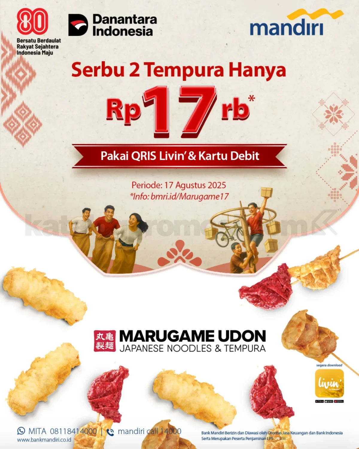 Khusus di tanggal 17 Agustus 2025, Marugamates bisa serbu promo spesial Merdeka dengan 2 tempura pilihan cuma Rp17.000 aja. Varian yang bisa dipilih antara lain Gyoza Merah Putih, Chikuwa, atau Skewered Shumai. Promo ini berlaku untuk dine-in di semua outlet Marugame Udon, kecuali outlet bandara, dengan minimal transaksi Rp200.000 sebelum pajak dan pembayaran menggunakan QRIS Livinโ Mandiri atau kartu debit Mandiri.