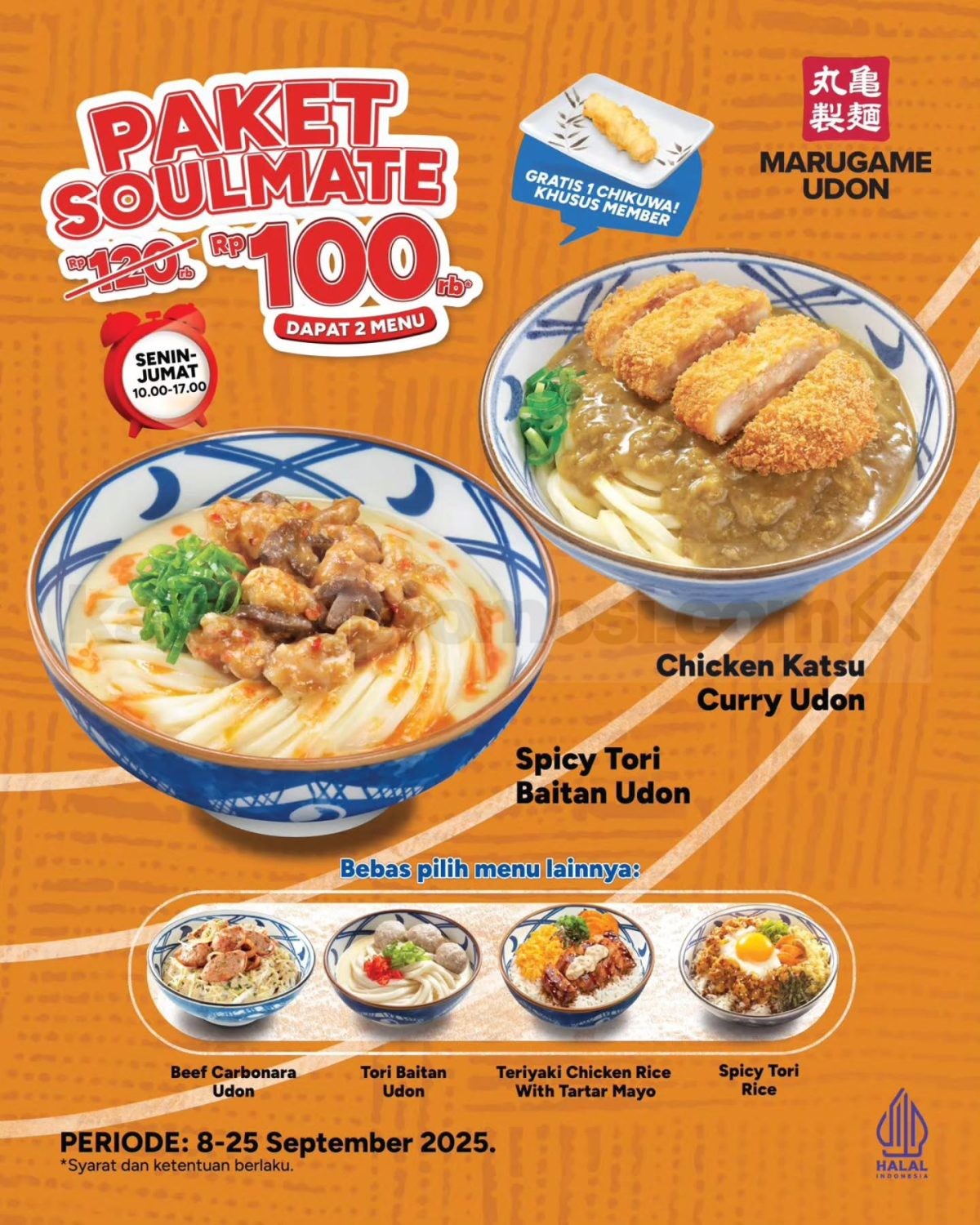 Promo Marugame Udon Paket Soulmate 2 menu Rp100.000 berlaku 8 – 25 September 2025 Senin – Jumat pukul 10.00 – 17.00 di outlet tertentu.
