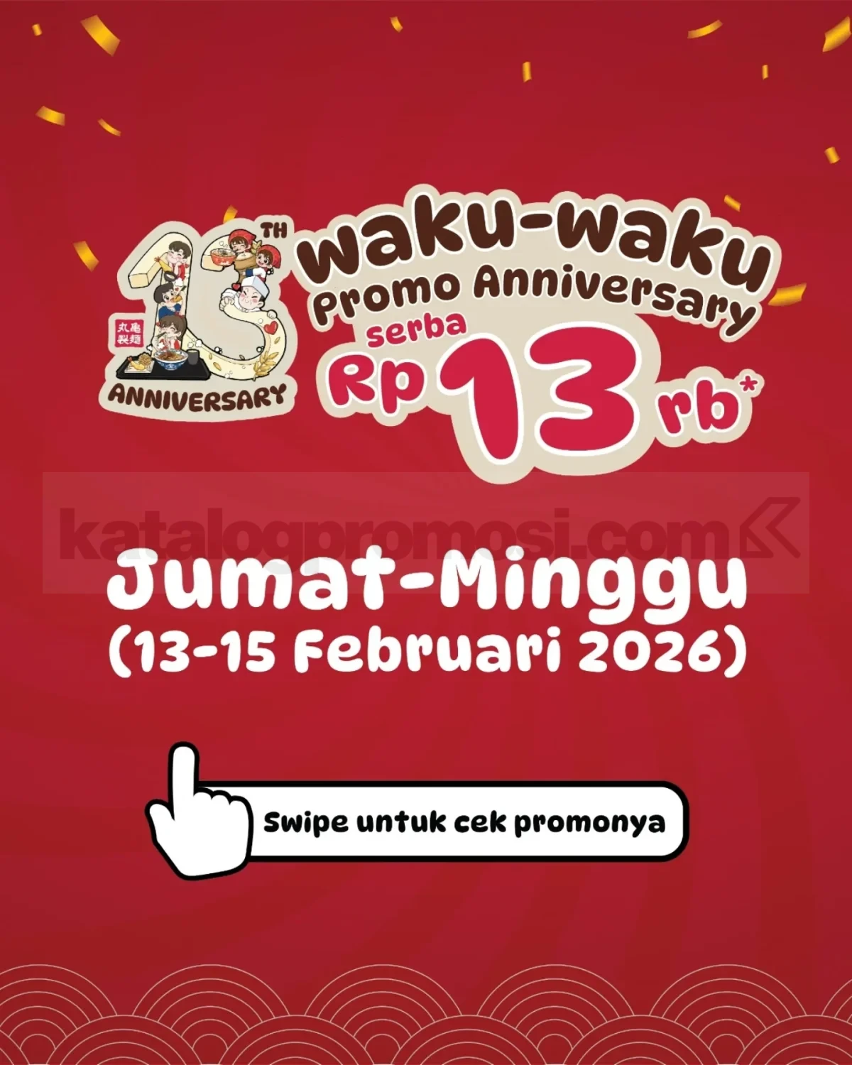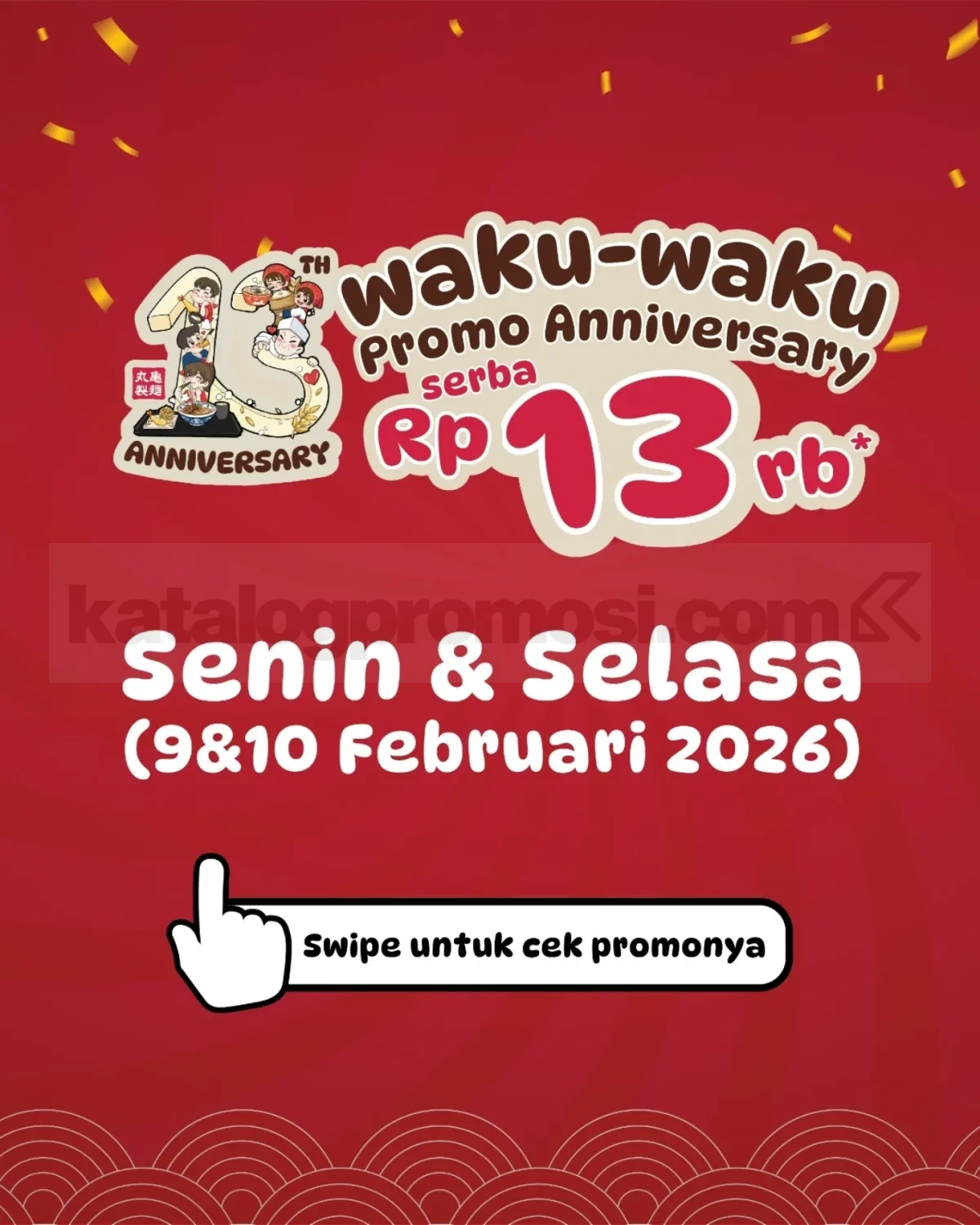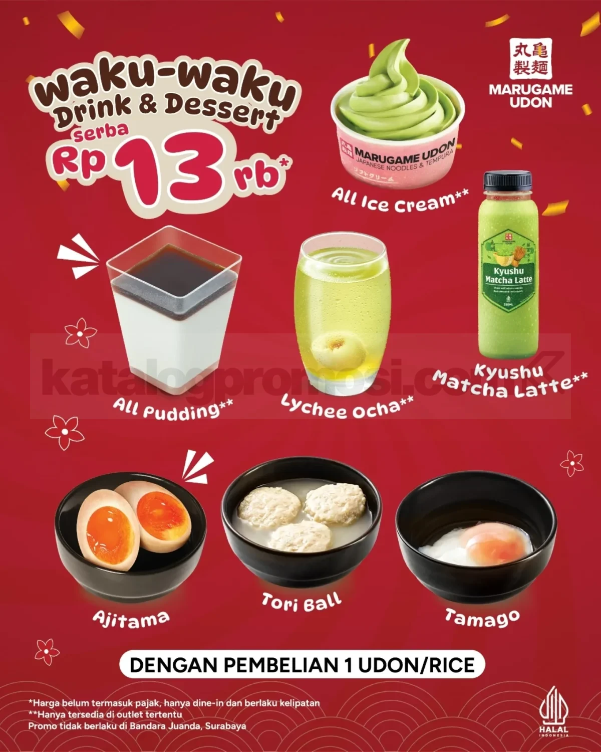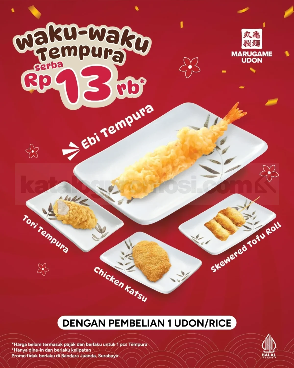 Promo Marugame Udon Waku-Waku Anniversary Serba Rp. 13.000 berlaku pada periode 9–15 Februari 2026 dan menghadirkan menu berbeda setiap harinya. Mulai dari aneka tempura, dessert, minuman, hingga Kake Udon, semuanya bisa dinikmati dengan harga yang sama selama disertai pembelian 1 main dish berupa udon atau nasi dengan harga normal.