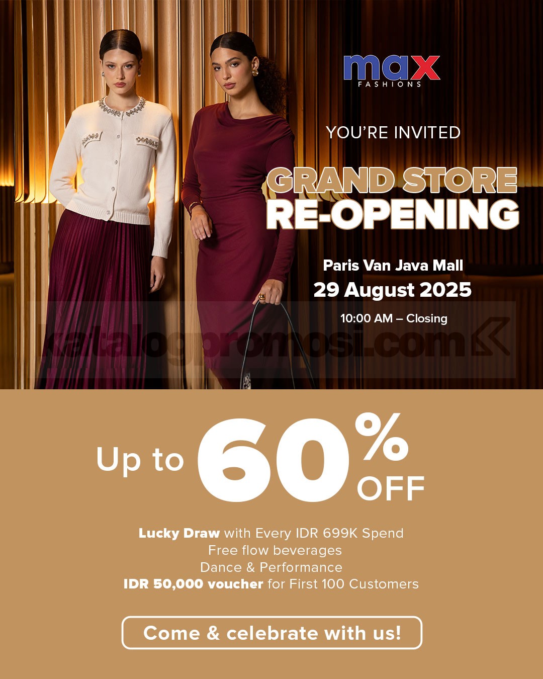 Promo Max Fashions Paris Van Java Grand Re-Opening diskon hingga 60% plus lucky draw, voucher Rp50.000, free flow beverages, dan hiburan pada 29 Agustus 2025.