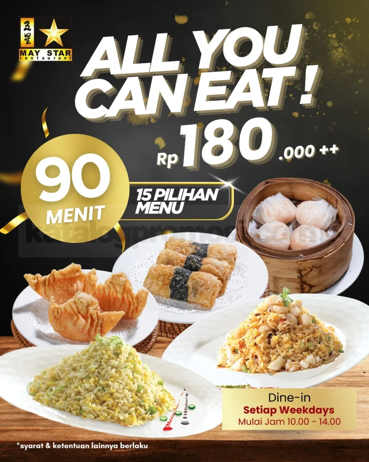 Promo May Star Mal Artha Gading All You Can Eat Rp180.000 dengan 15 pilihan menu, durasi 90 menit, berlaku mulai 14 Agustus 2025 di Mal Artha Gading khusus weekdays.