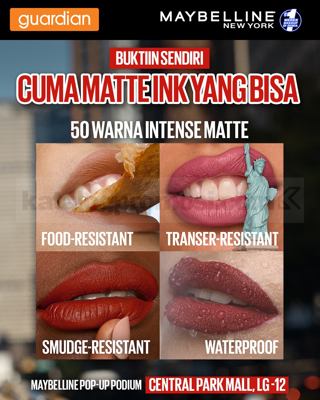 β¨ Siap tampil kece dari pagi sampai malam? Maybelline Pop Up Podium lagi hadir di Central Park Mall! Kamu bisa rasakan sendiri Cuma Matte Ink yang bisa food-resistant, transfer-resistant, smudge-resistant, dan waterproof! π₯π
