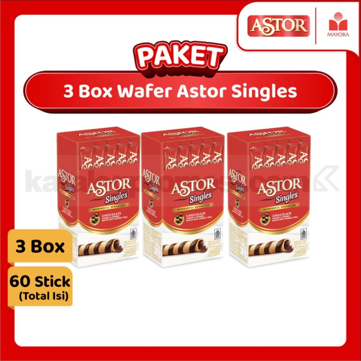 Paket promo terdiri dari 3 Box Wafer Astor Singles dengan total 60 stick.