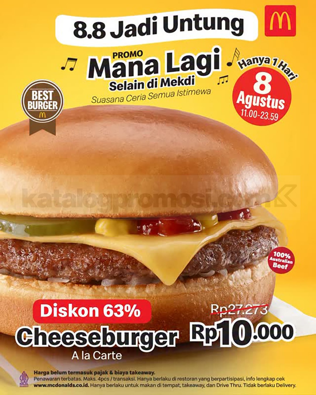 Promo McDonald’s 8.8 Cheeseburger a la carte Rp10.000 berlaku 8 Agustus 2025 pukul 11.00–23.59 untuk dine-in, takeaway, dan Drive Thru