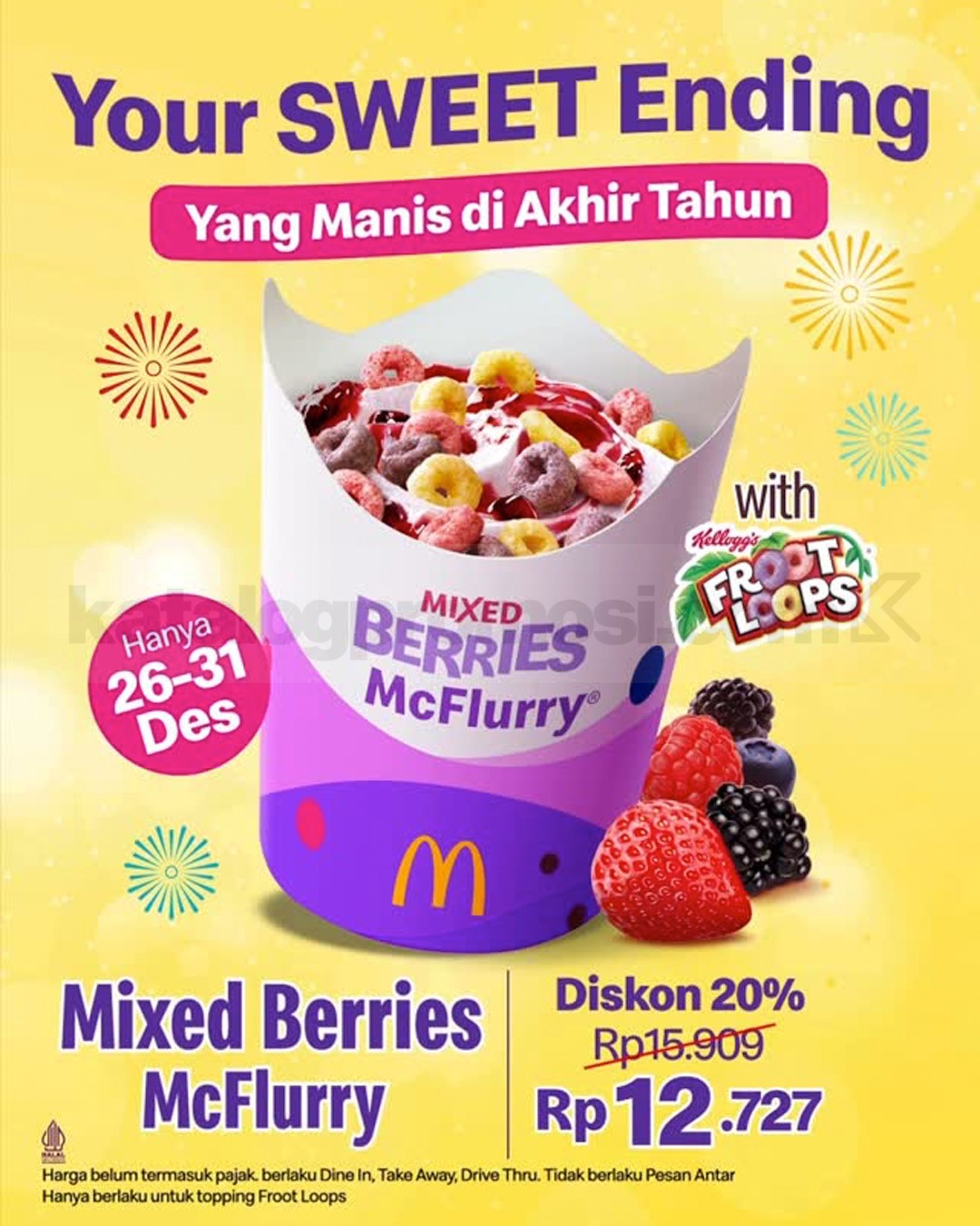 Promo McFlurry akhir tahun ini cocok buat yang lagi cari dessert segar dengan harga lebih hemat. Selama promonya masih jalan, langsung mampir ke McDonalds terdekat dan nikmati Mixed Berries McFlurry dengan topping Froot Loops.