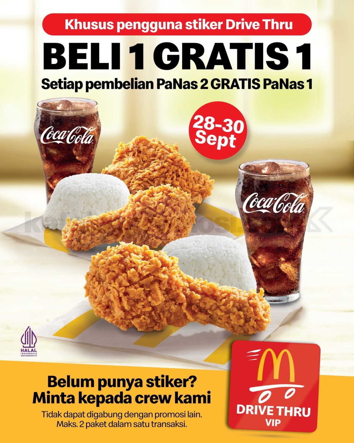 Promo McDonalds Drive Thru Beli 1 Gratis 1 PaNas berlaku 28–30 September 2025 di seluruh outlet Drive Thru untuk pengguna stiker Drive Thru Mekdi.