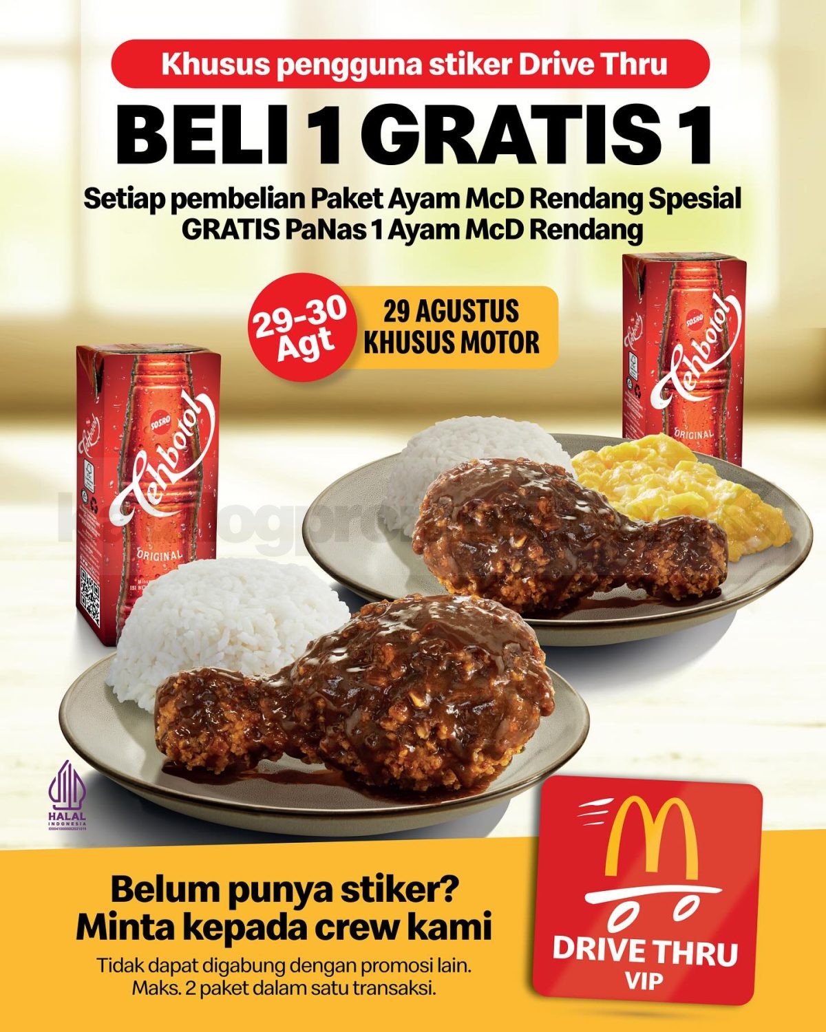 Promo McDonald’s Drive Thru Beli 1 Gratis 1 Ayam Rendang hadir meriahkan bulan kemerdekaan! 🇮🇩 Khusus pengguna stiker Drive Thru, nikmati promo spesial pada tanggal 29 – 30 Agustus 2025.