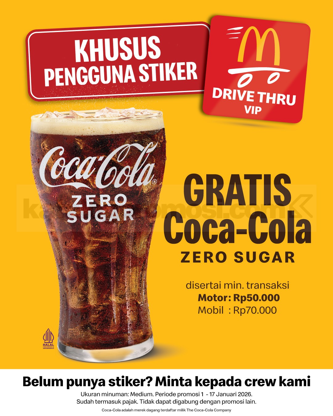 Promo MCDONALDS Drive Thru GRATIS Coca-Cola Zero Sugar berlaku mulai tanggal 1 – 17 Januari 2026. Khusus pengguna stiker Drive Thru dengan minimum transaksi tertentu, minuman langsung didapat tanpa biaya tambahan.