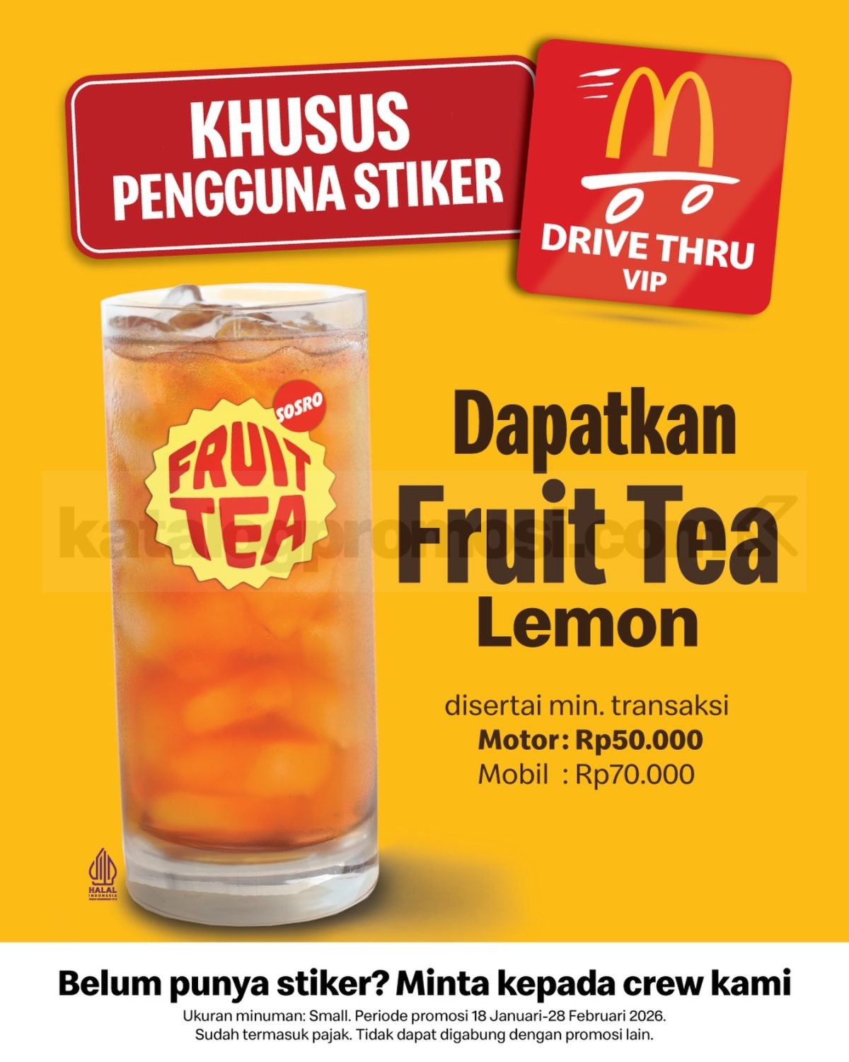 Promo MCDONALDS Drive Thru gratis Fruit Tea Lemon ukuran small berlaku 18 Januari – 28 Februari 2026 khusus pengguna stiker Drive Thru Mekdi.