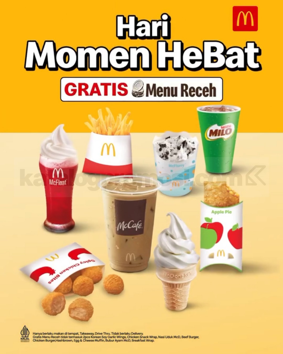 - Gratis satu Menu Receh dapat dipilih dari: Ice cream cone small, Sundae (Choco/Strawberry), McFlurry (OREO/Choco), McFloat (Coke/Fanta), French Fries small, MILO small, Spicy Chicken Bites, Iced Coffee, Apple Pie.